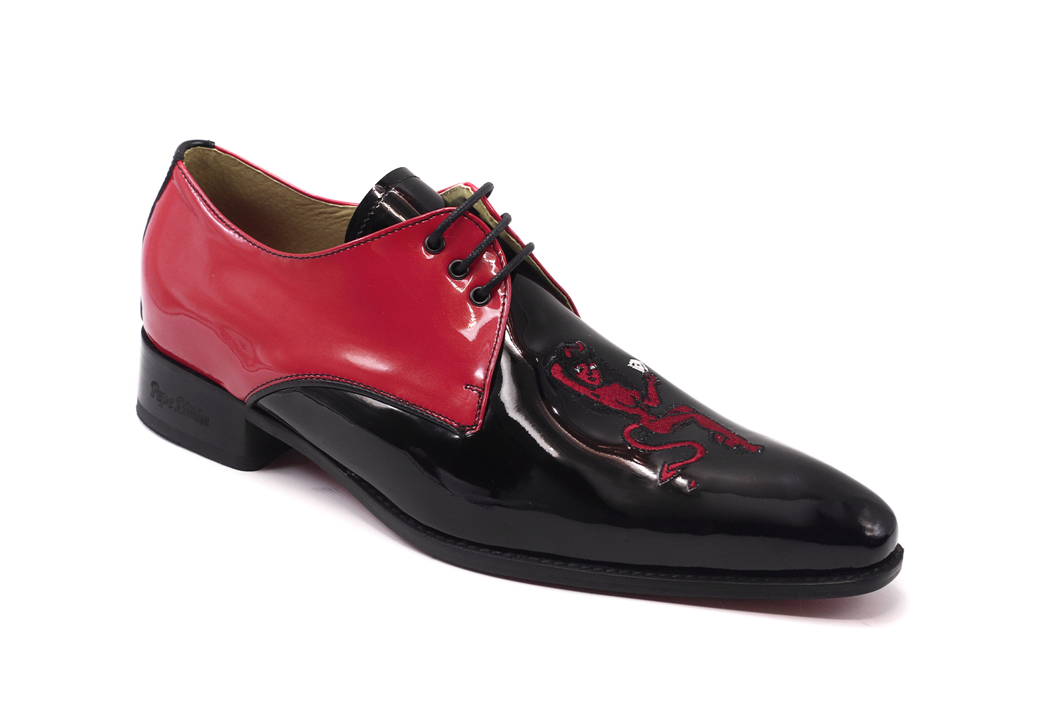 Special design in black and red patent leather with a beautiful embroidery of a devil in red and black that perfectly matches the color of the shoe and makes it stand out even more.