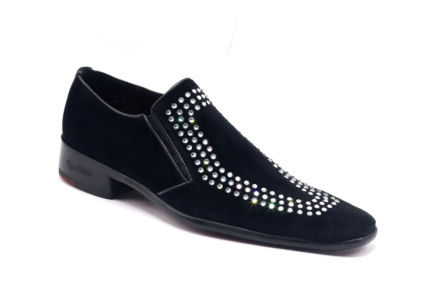 Diamond model shoe, designed in Black velvet, inlaid with shiny stones, red leather sole with a non-slip central area and with high quality materials for maximum comfort for everyone.