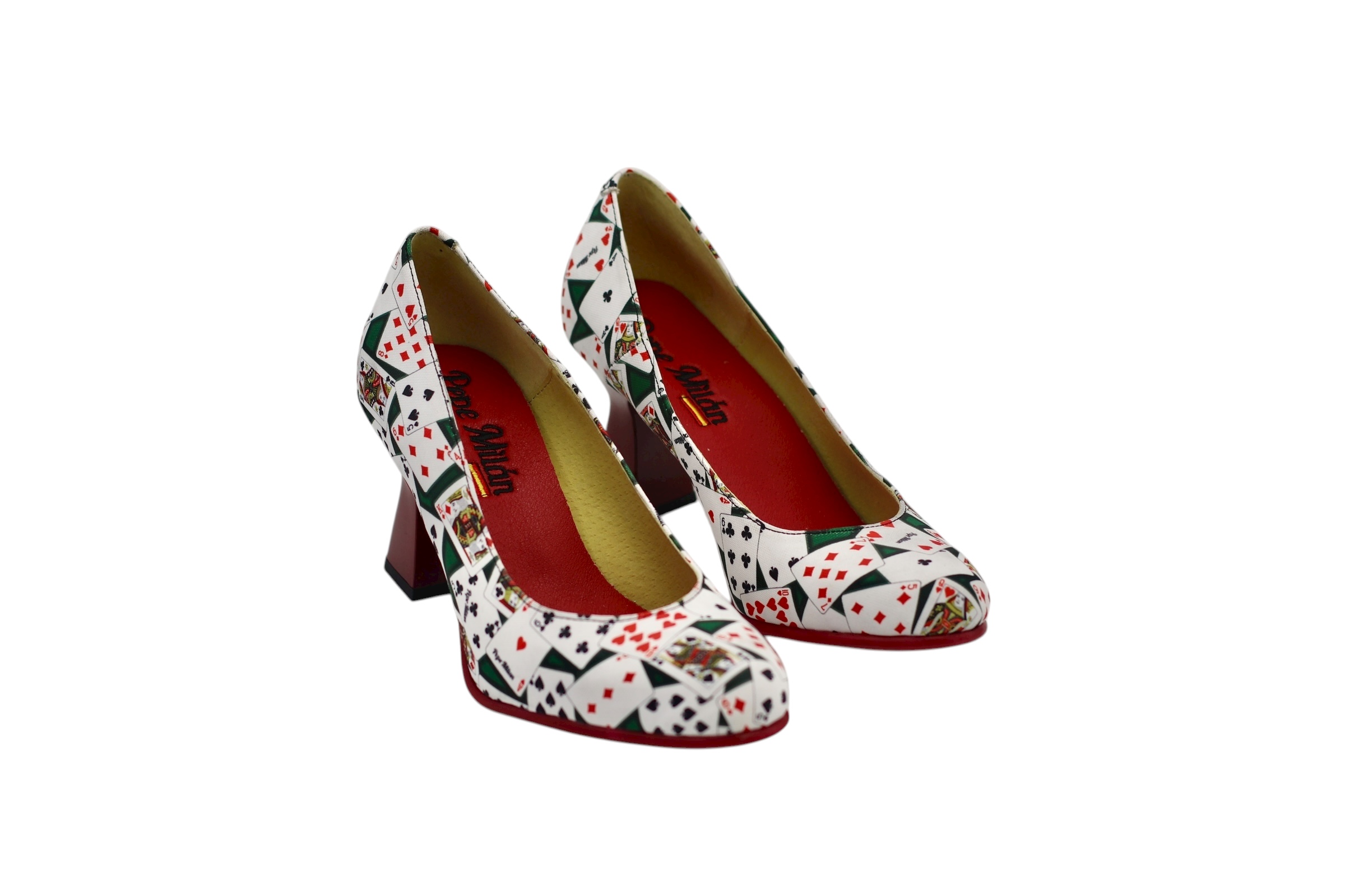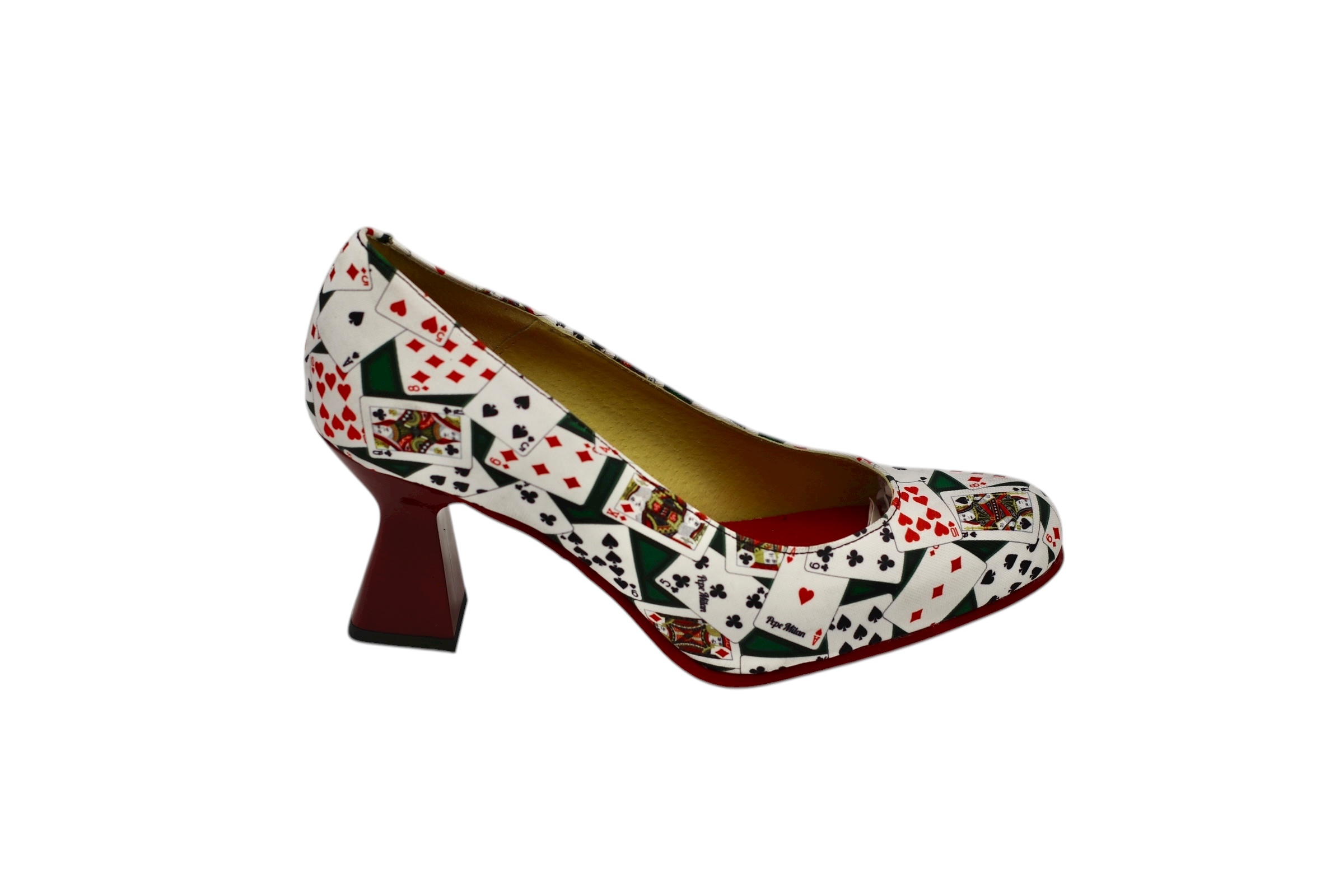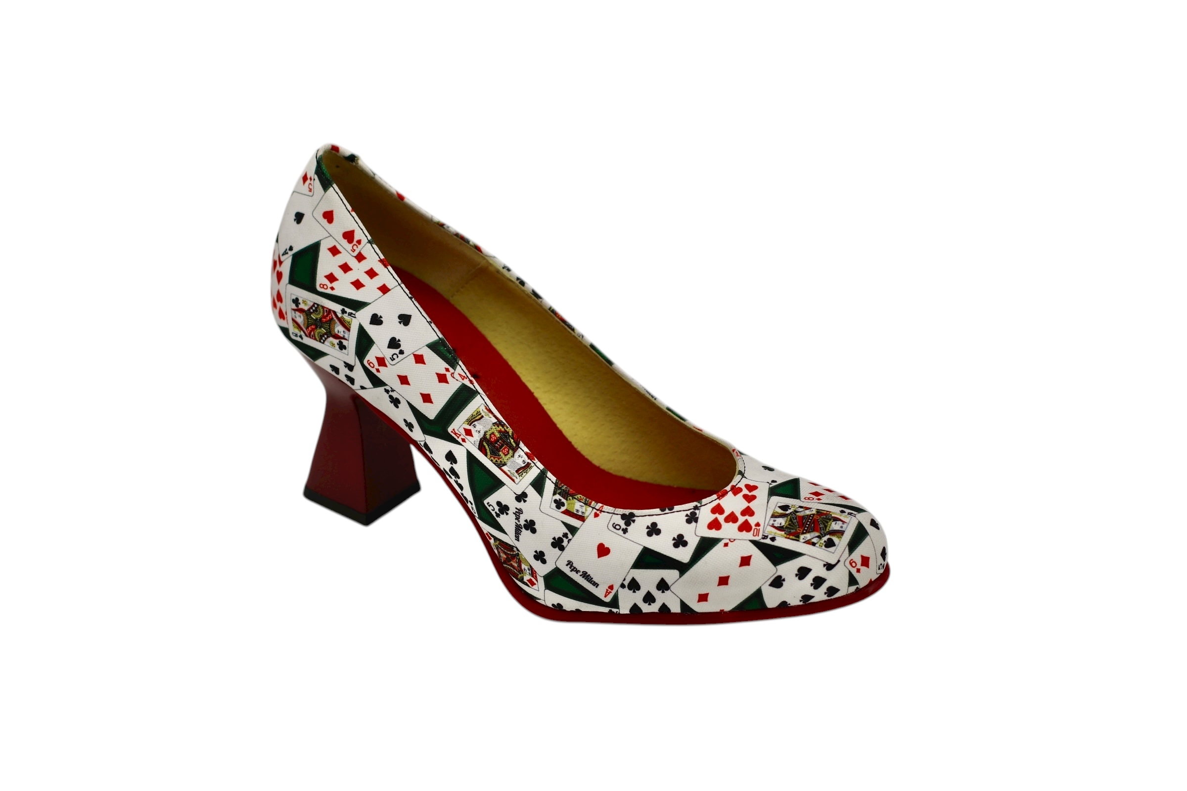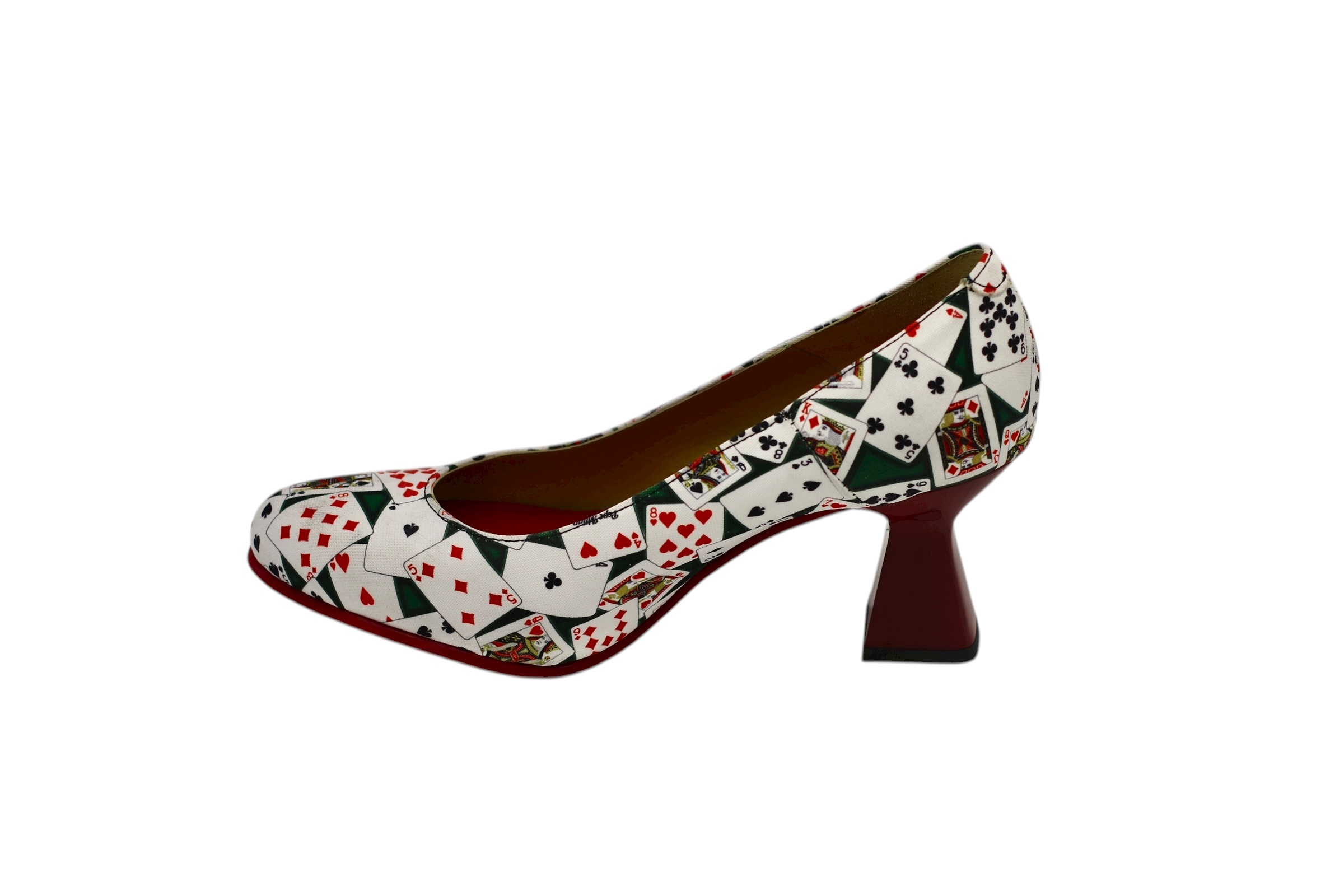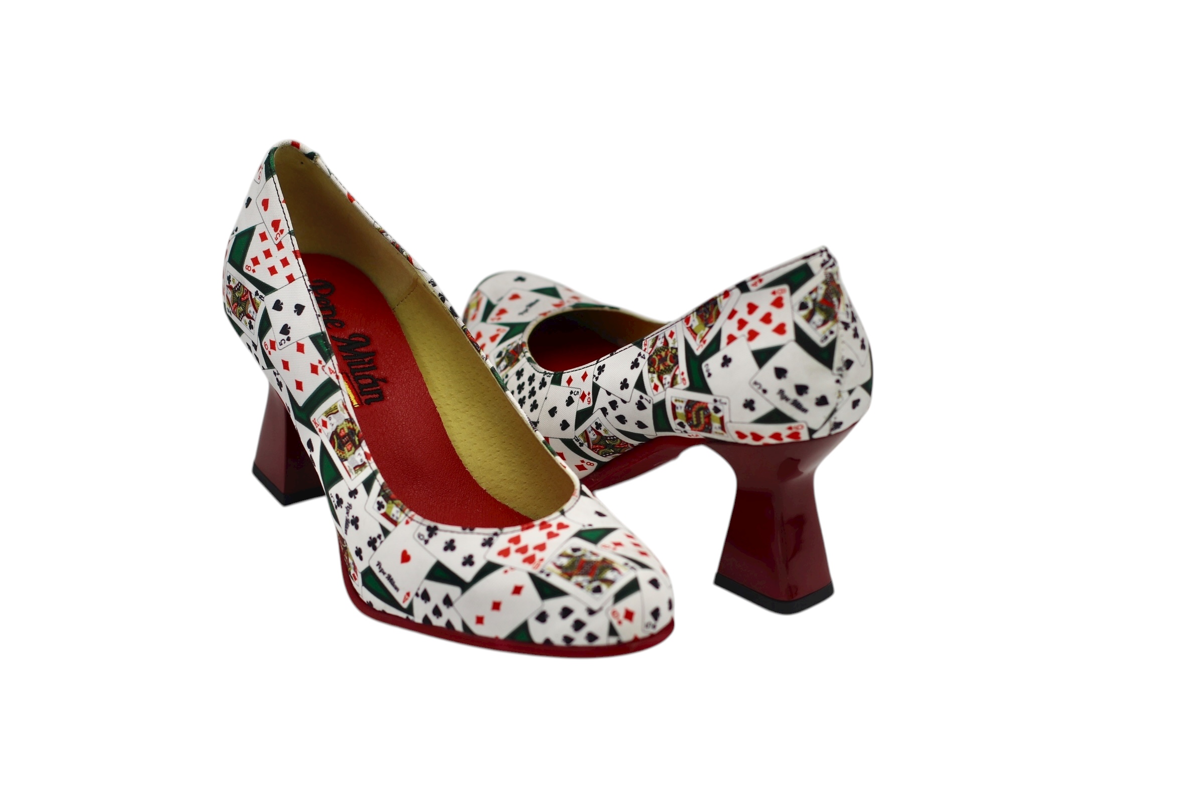 Mid-heel shoe, designed in a poker-inspired style, with a non-slip red skate sole made from the highest quality materials for maximum comfort for all our customers.