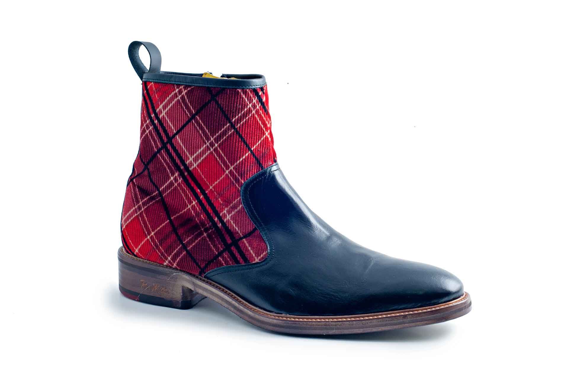 Boot designed in black nappa leather and red tartan, with top quality materials for the maximum comfort of all our customers.