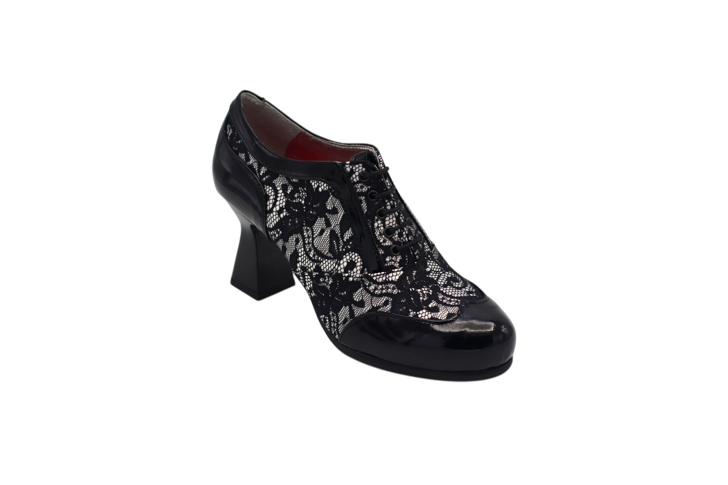 Mid-heel shoe designed in waxed nappa leather and black patent leather, with a non-slip rubber sole made with high-quality materials for maximum comfort for all our customers.