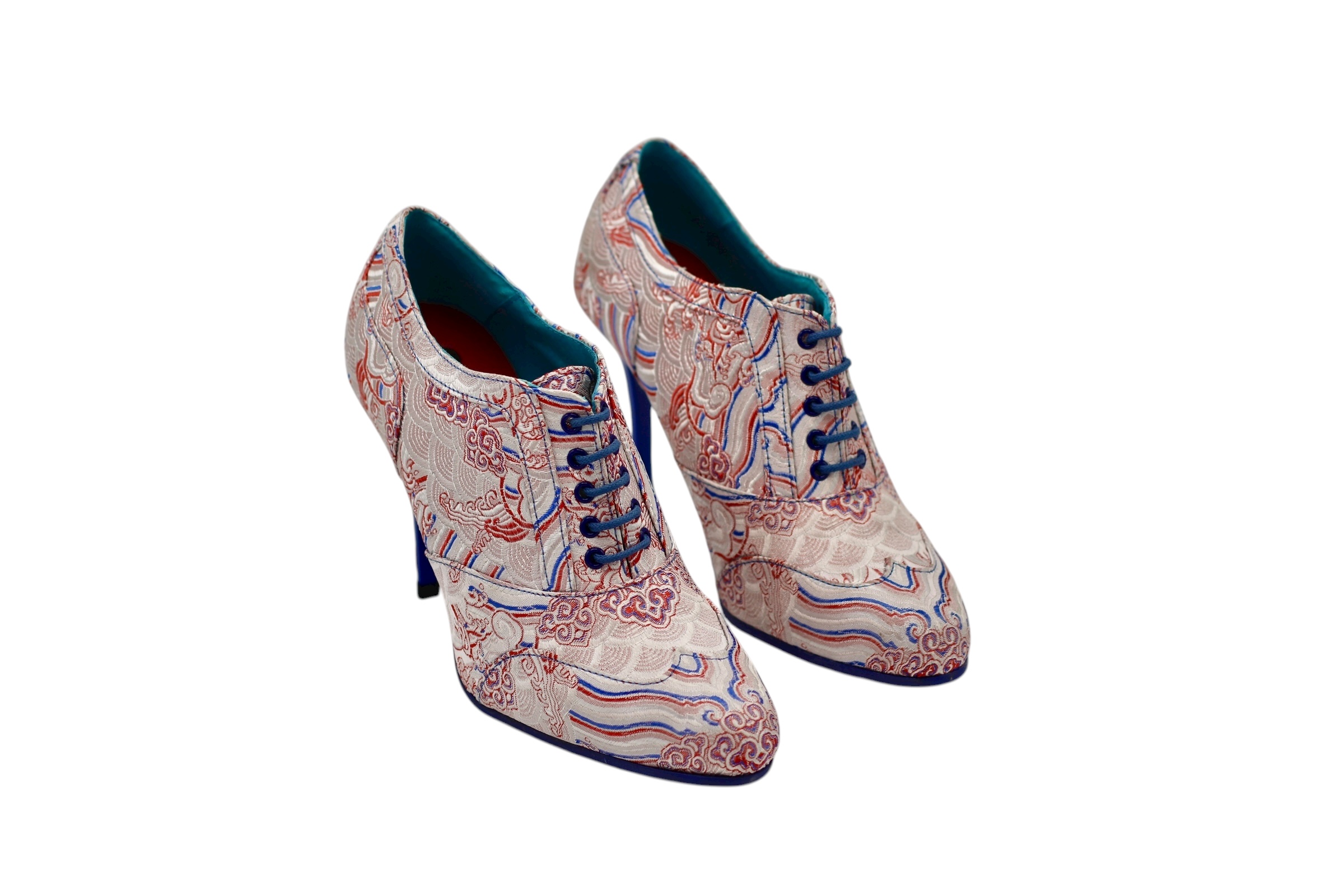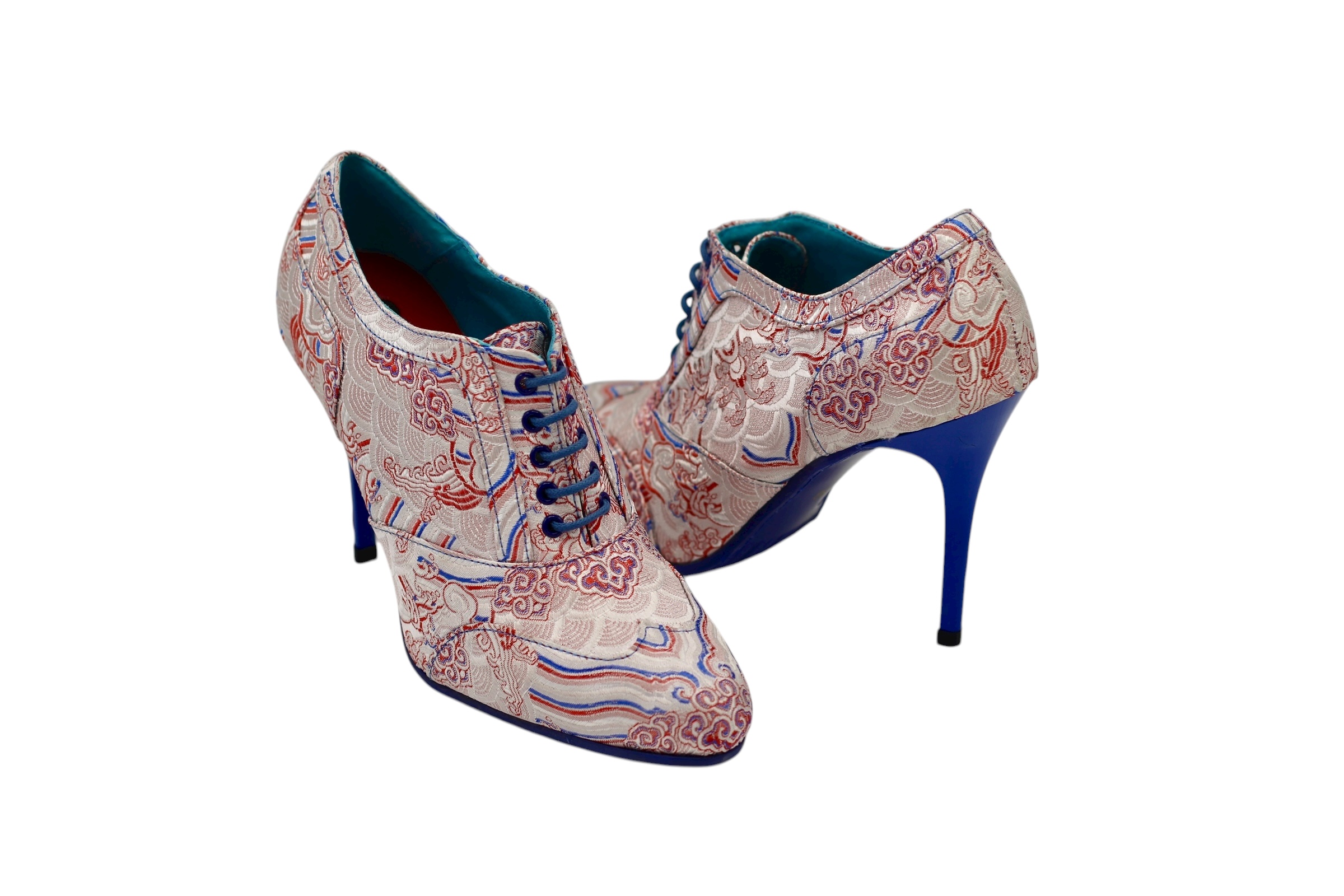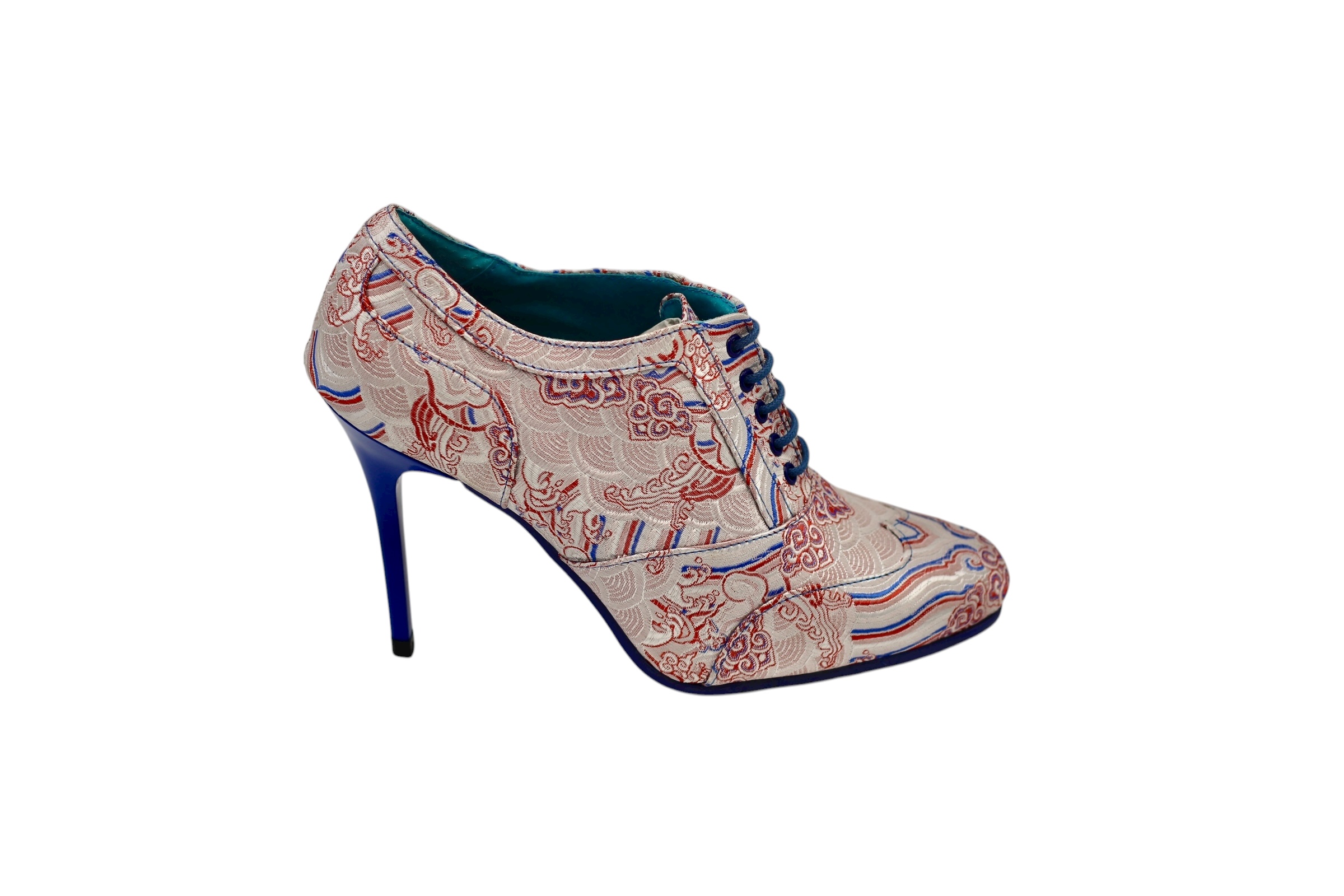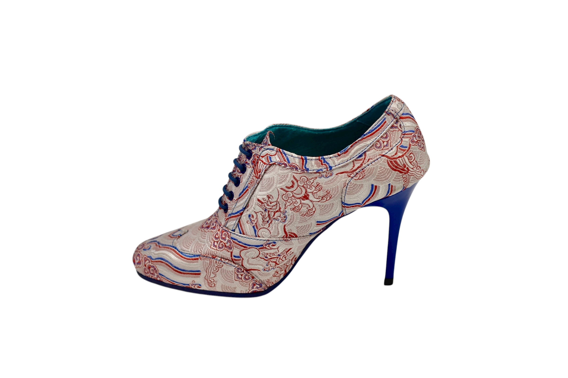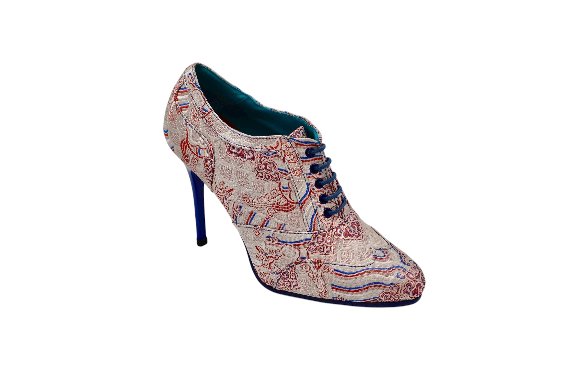 High-heeled shoe, designed in Miami textile, with a non-slip blue rubber sole made from the highest quality materials for maximum comfort for all our customers.
