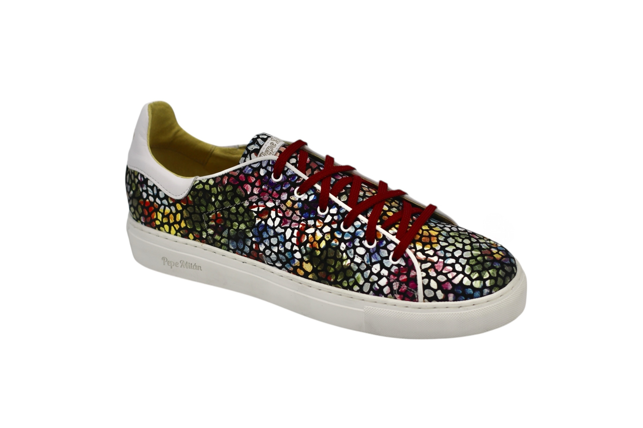 Piedras Multi sneakers, white Bombay rubber sole, vibrant leather prints, comfort and style for your feet.