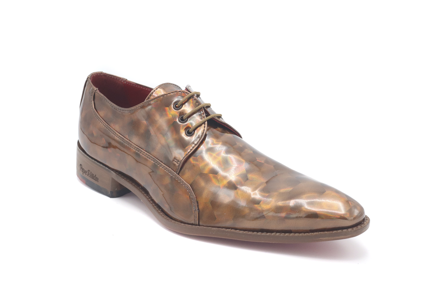 Patent leather shoe, designed in Tiger eye patent leather, red leather sole with a non-slip central area and with high quality materials for the maximum comfort of all our clients.