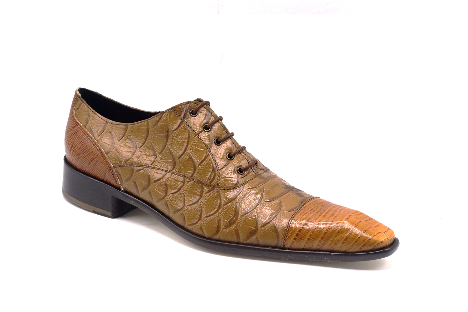 Zapato de napa, diseñado en napa Desert ANACONDA MIEL Y TANGANICA MARRON Horma Raul, suela de cuero . Magnífico modelo que destaca por su originalidad, característica de la marca Pepe Milán.