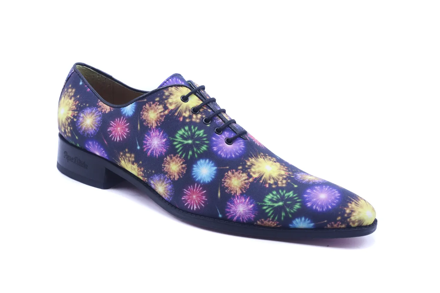 Modelo Fireworks, diseñado en textil Fantasía Fireworks TEX-MT, con suela de cuero y goma en el centro, antideslizante, con fabricación Blake, suela cosida.