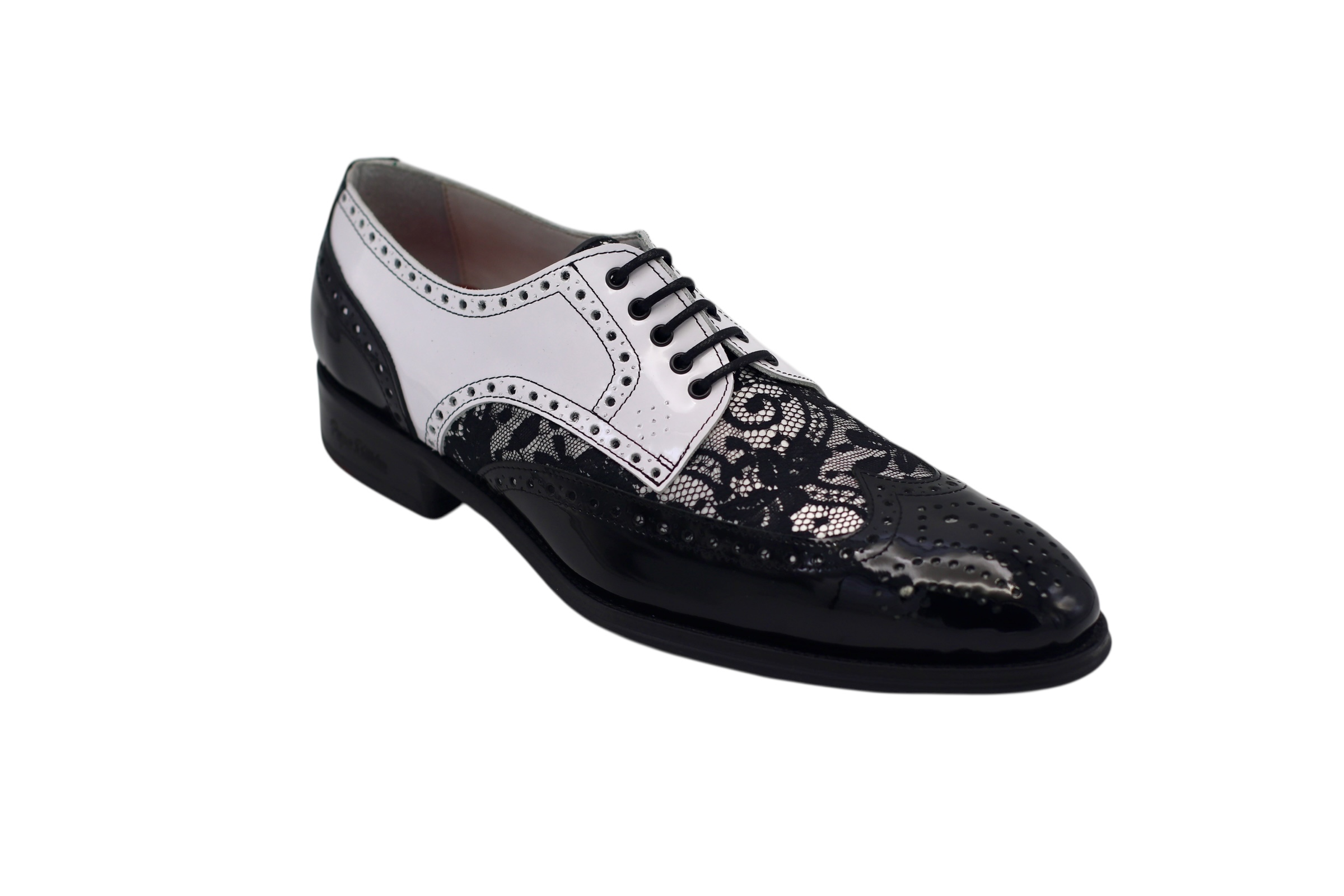 Diseño que combina dos tonos de charol negro y blanco combinado con un encaje bicolor blanco y negro que crea una imagen inigualable para conjuntar con cualquier tipo de prenda.