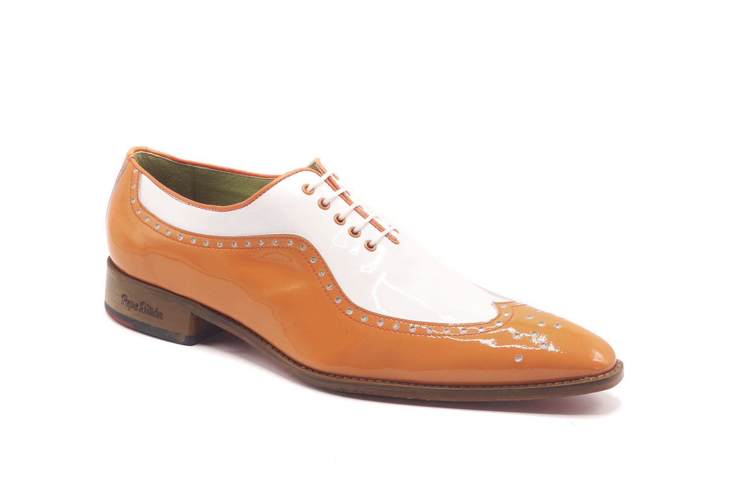 Zapato de charol, diseñado en Charol Blanco y Charol Coral, suela de cuero roja con una zona central antideslizante y con materiales de altisima calidad para la maxima comodidad de todos nuestros clientes.