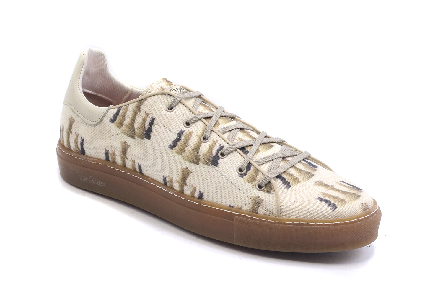 Sneaker modelo Diagonal, diseñado en Lino Crudo Fantasia Ajedrez Napa Marfil Forro Cambrelle Hilos Beige Piso Bombay Caramelo