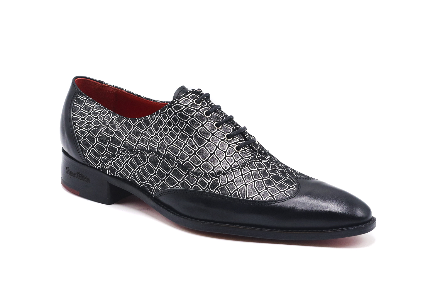 Zapato de napa, disenado en Napa Elio Negra 112 Fene Silver Horma cuba y suela de cuero roja con una zona central antideslizante con unos materiales de altisima calidad para la maxima comodidad de todos nuestros clientes.