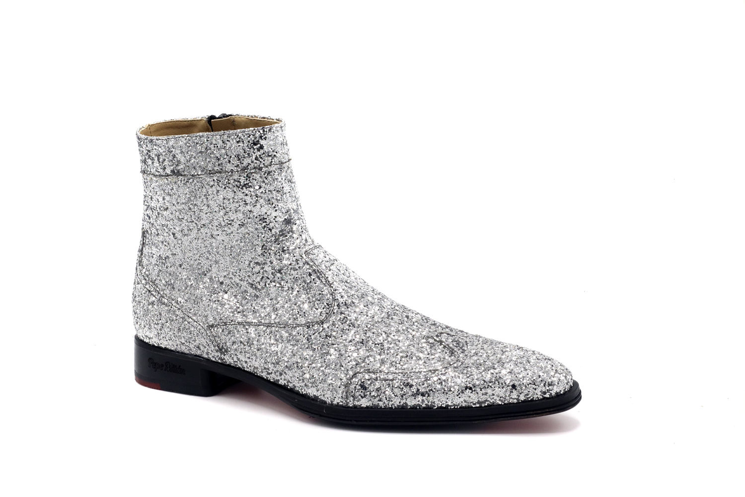 Botín modelo Glow, diseñado en GLITTER PLATA Horma Cuba y suela combinada. Magnífico modelo que destaca por su originalidad, característica de la marca Pepe Milán.