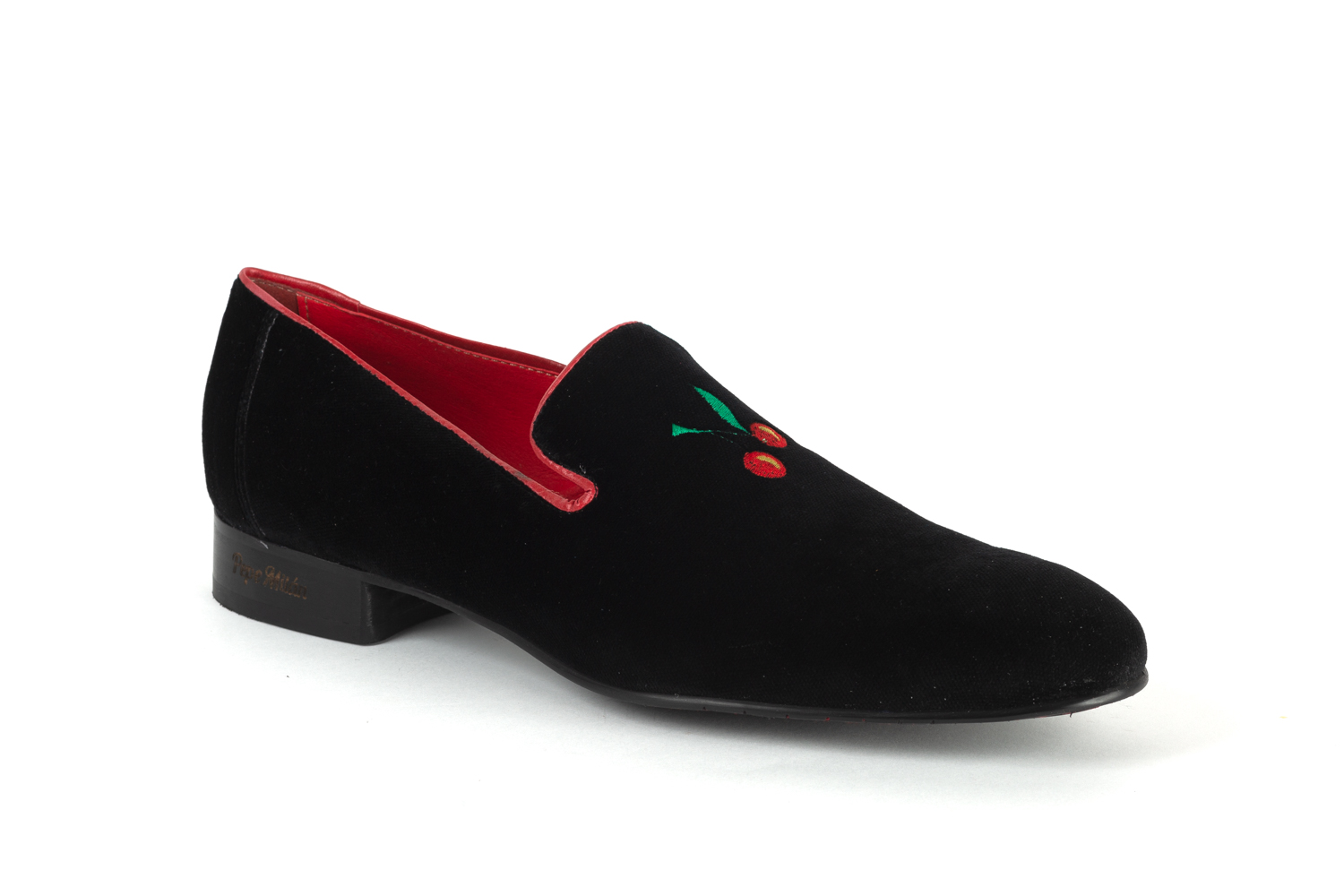 Zapato modelo Guindo, diseñado en TERCIOPELO NEGRO BORDADO CEREZAS, piso de goma negro antideslizante con materiales de altisima calidad para la maxima comodidad de todos nuestros clientes.
