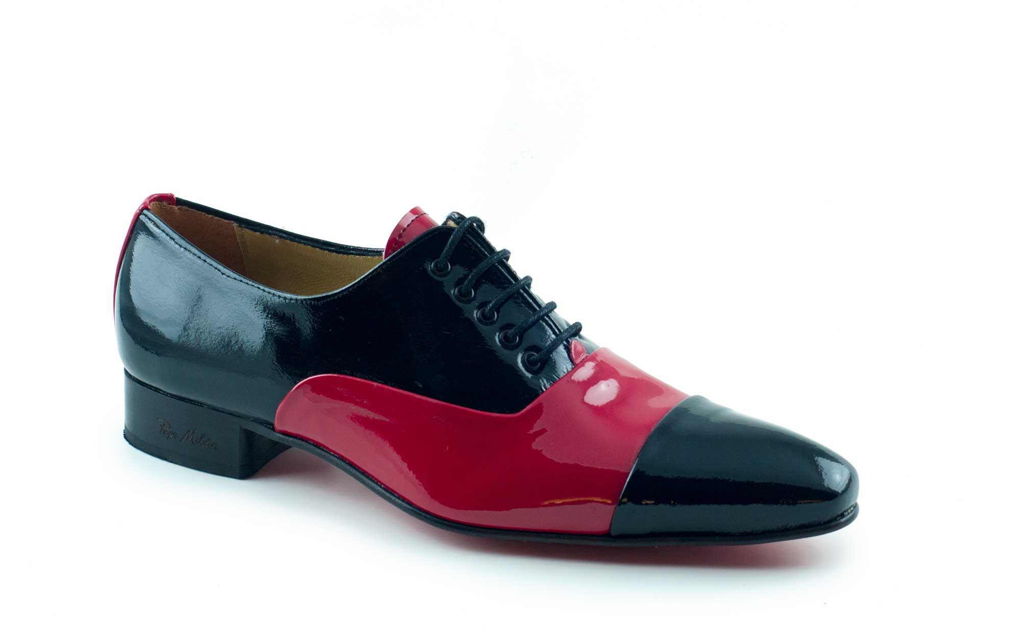 Zapato de charol, diseñado en charol Inferno, suela de cuero roja con una zona central antideslizante y con materiales de altisima calidad para la maxima comodidad de todos nuestros clientes.