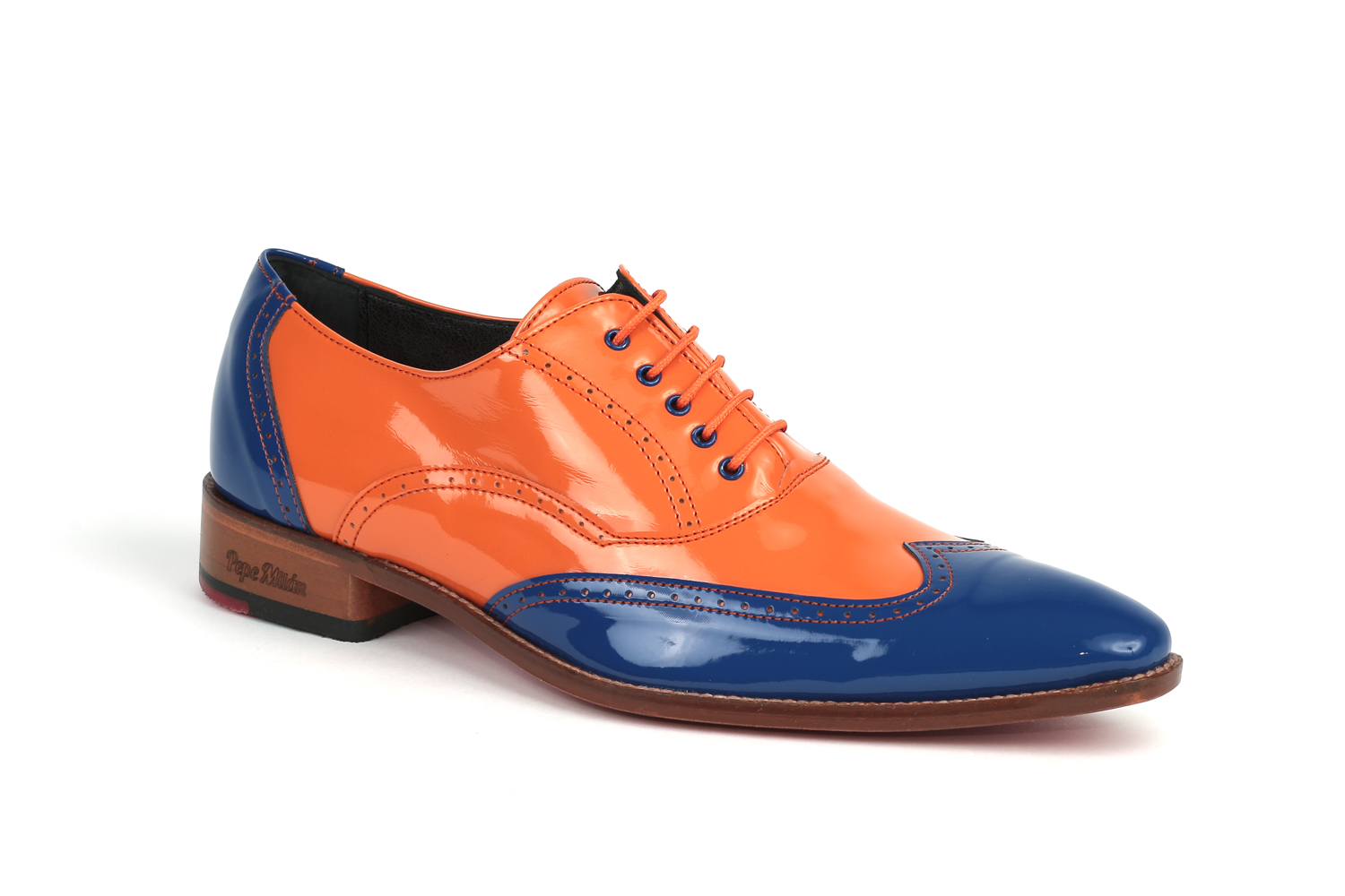 Diseño bicolor con unas tonalidad unicas que combina el charol azul milán con el charol naranja.
