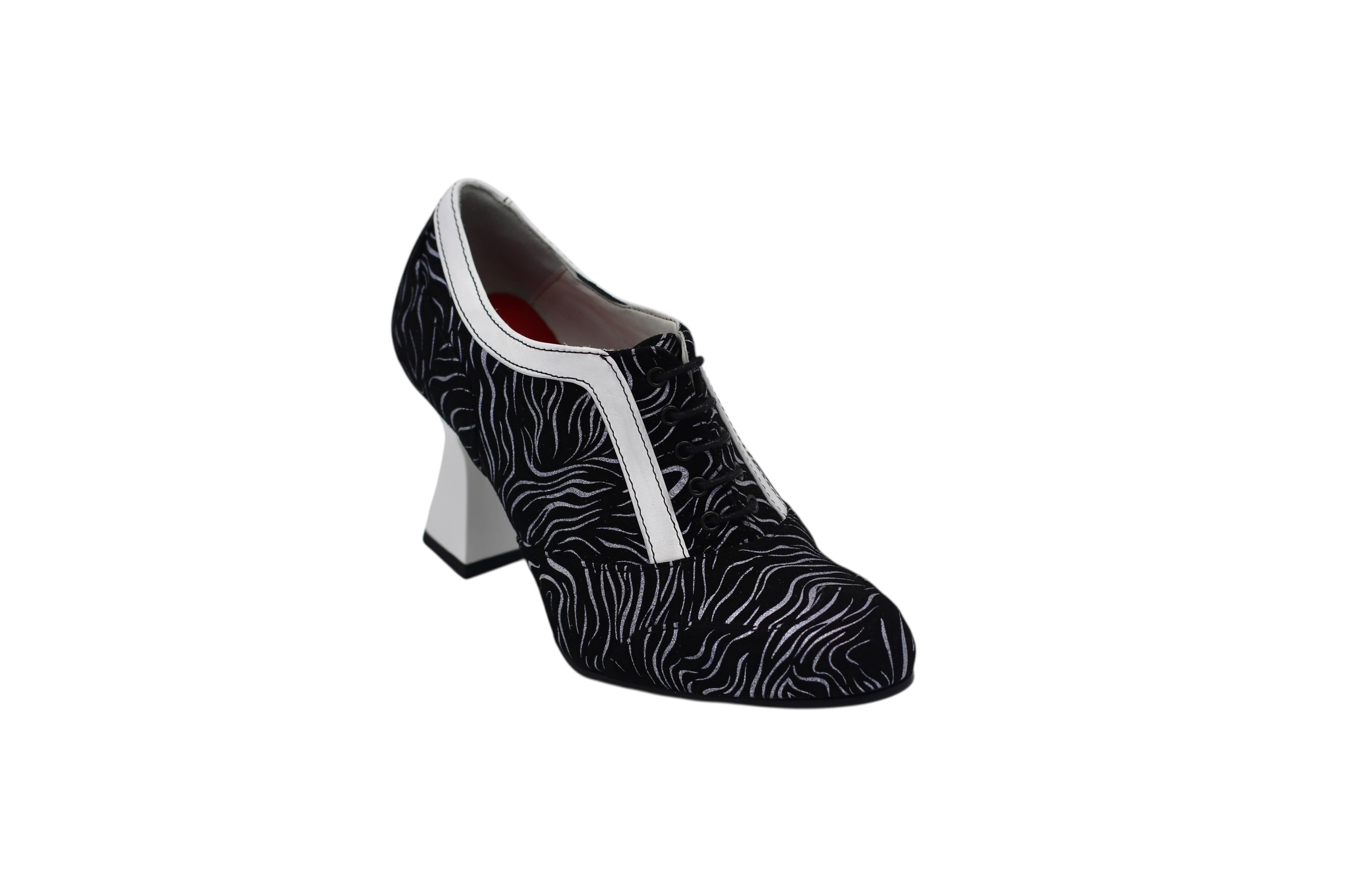 Zapato de tacon medio diseñado en napa lacre y charol blanco, suela de goma antideslizante con materiales de altisima calidad para la maxima comodidad de todos nuestros clientes.