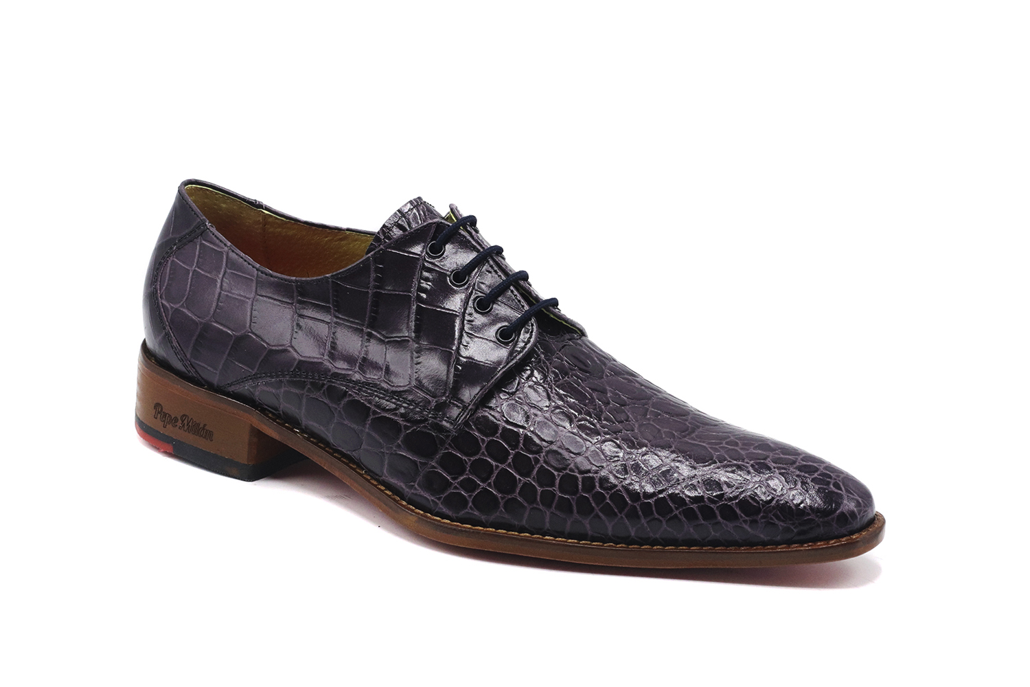 Zapato de napa, diseñado en Aligator Berenjena Horma Cuba y suela de cuero roja con una zona central antideslizante con unos materiales de altisima calidad para la maxima comodidad de nuestros clientes.
