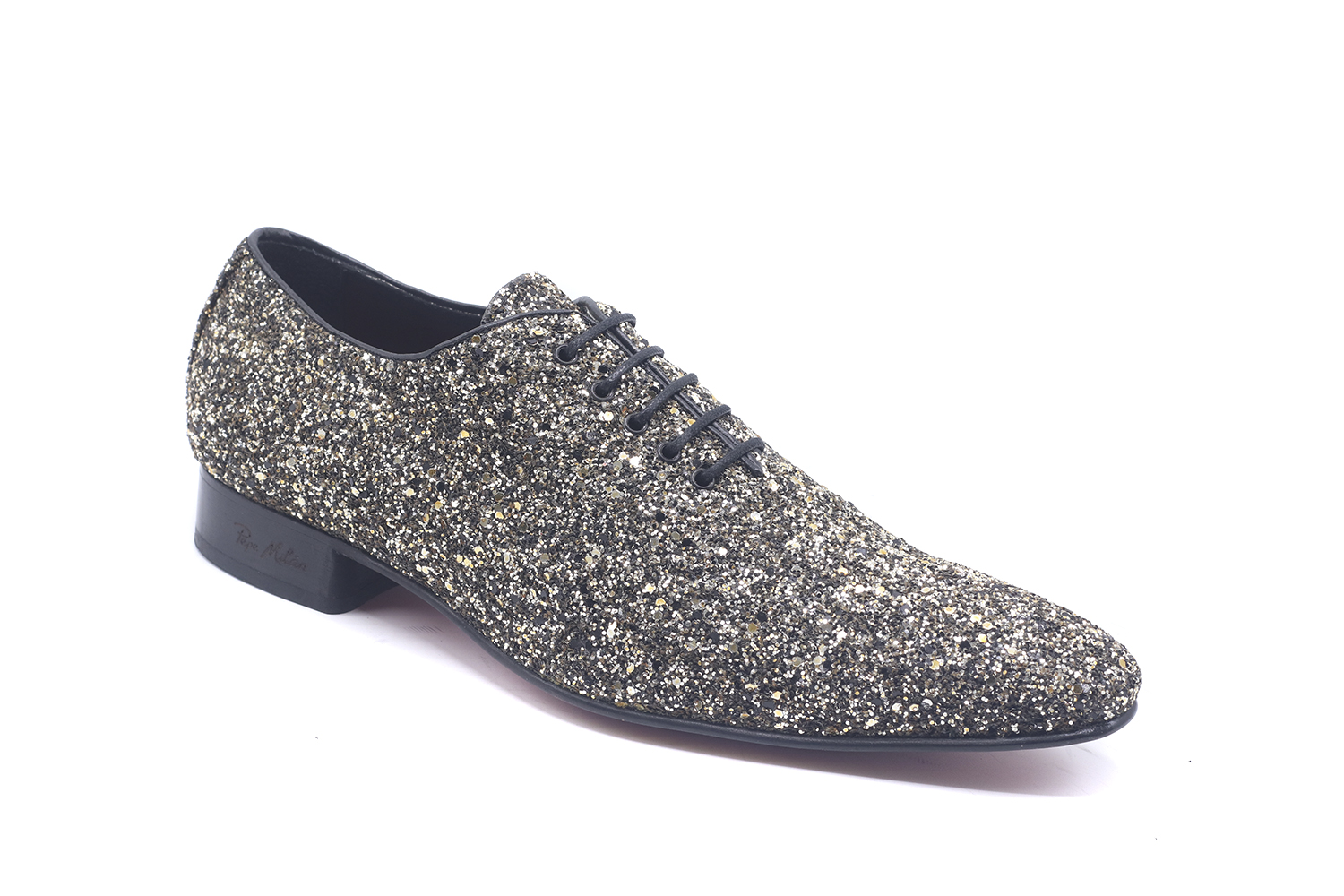 Diseñado en glitter oro negro, este calzado es brillante y exclusivo.