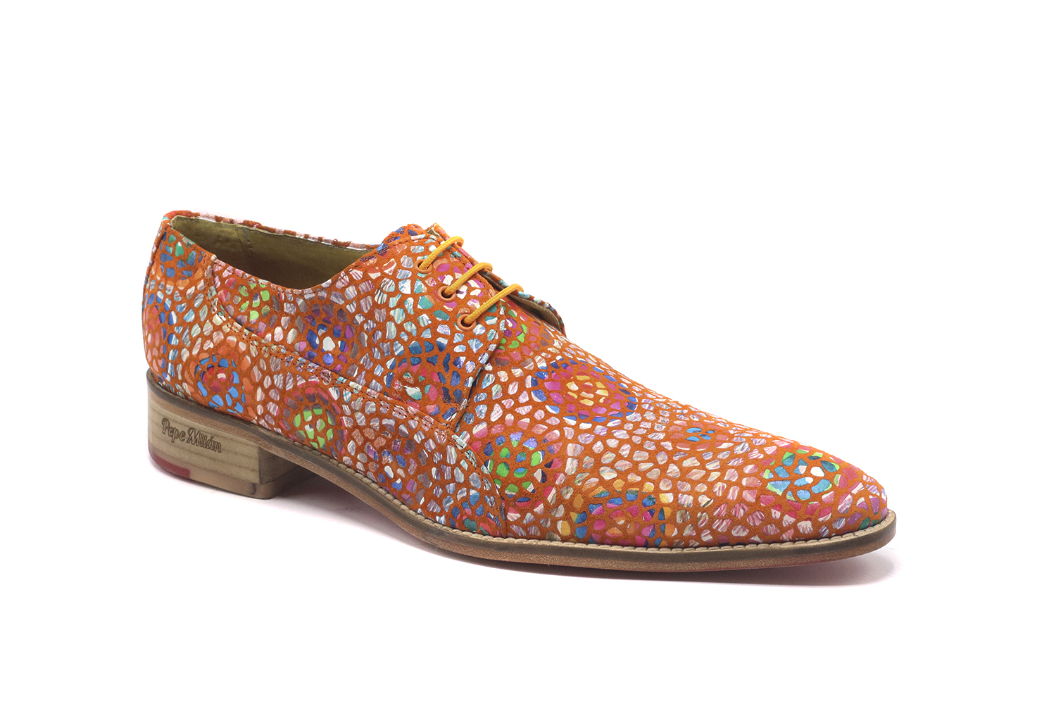 Diseño con unos colores fantasticos sobre una napa naranja que da una imagen de creación la cual es excelente y exclusiva de la marca Pepe Milán .