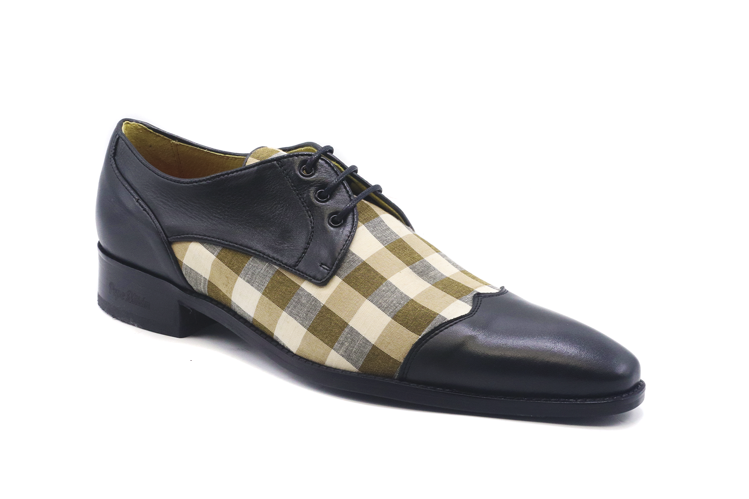 Zapato de textil, diseñado en Napa Negra y Escocés Beige con piso de goma Patín Milán color negro siguiendo el método de fabricación Blake