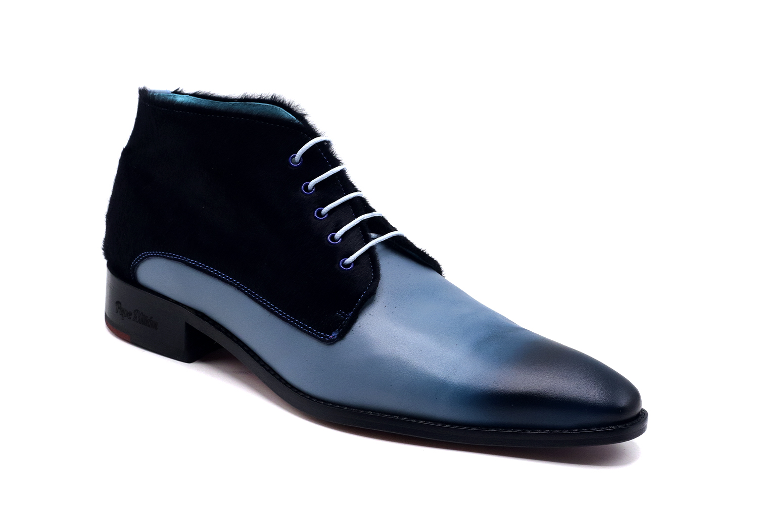 Botín diseñado en potro azul y napa cielo, suela de cuero, cosida, antideslizante. Modelo diferente, atrevido y rompedor. Consigue que tus pies definan quien eres.