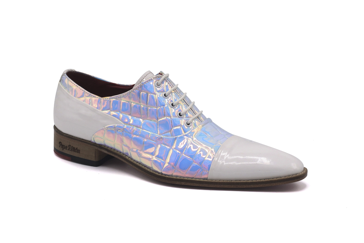 Combinación perfecta de charol blanco y material en fantasía iridiscente