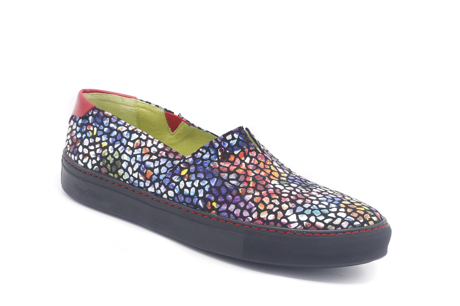 Zapato modelo Reflector, fabricado en Napa Mirror Multi Napa Roja Horma Altea y suela milán antideslizante. Magnífico modelo que destaca por su originalidad, característica de la marca Pepe Milán