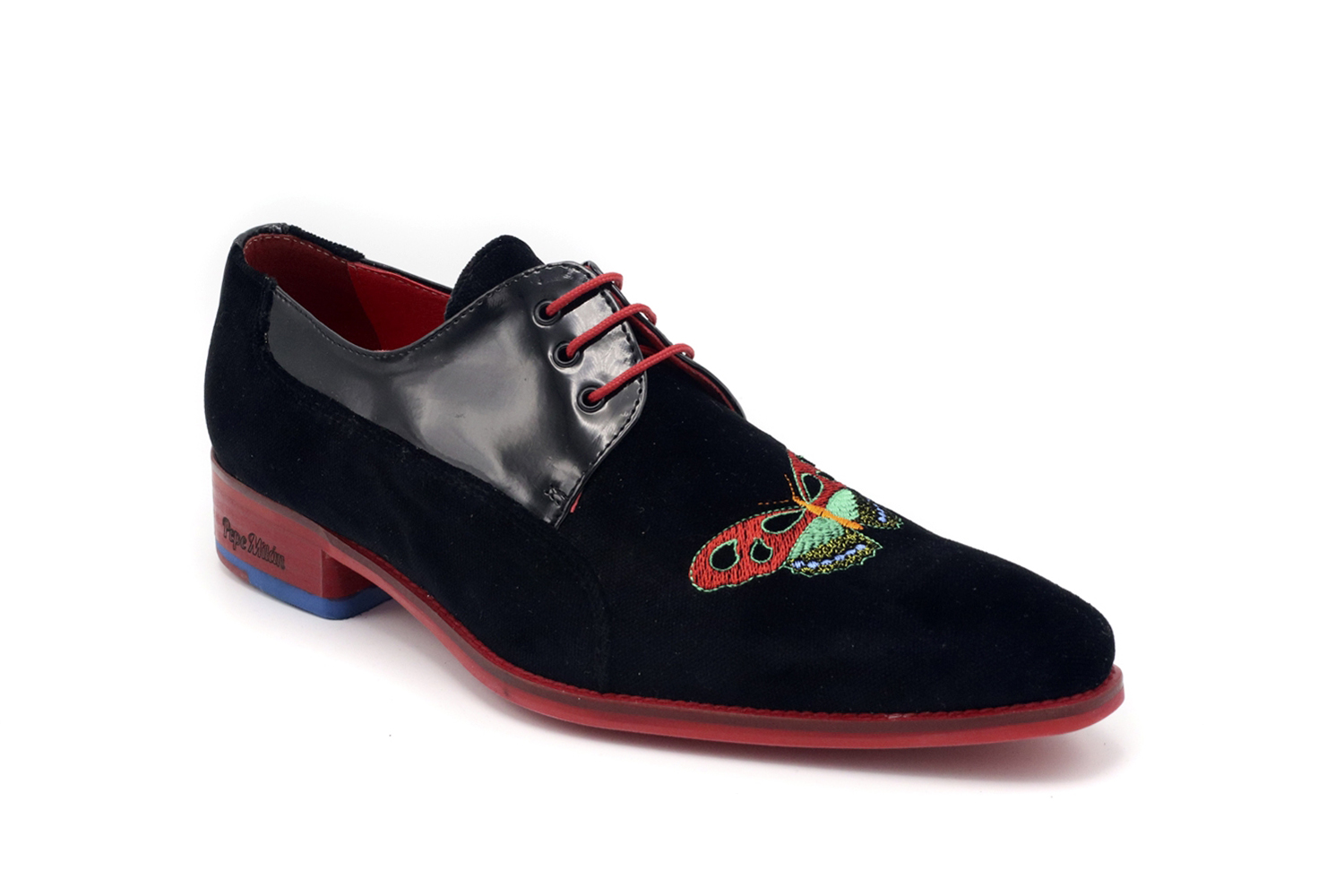 Zapato modelo Satisfaction, fabricado en TERCIOPELO NEGRO CH. NEGRO BORD. MARIPOSA Horma cuba y suela de patín milán roja antideslizante. Magnífico modelo que destaca por su originalidad, característica de la marca Pepe Milán.