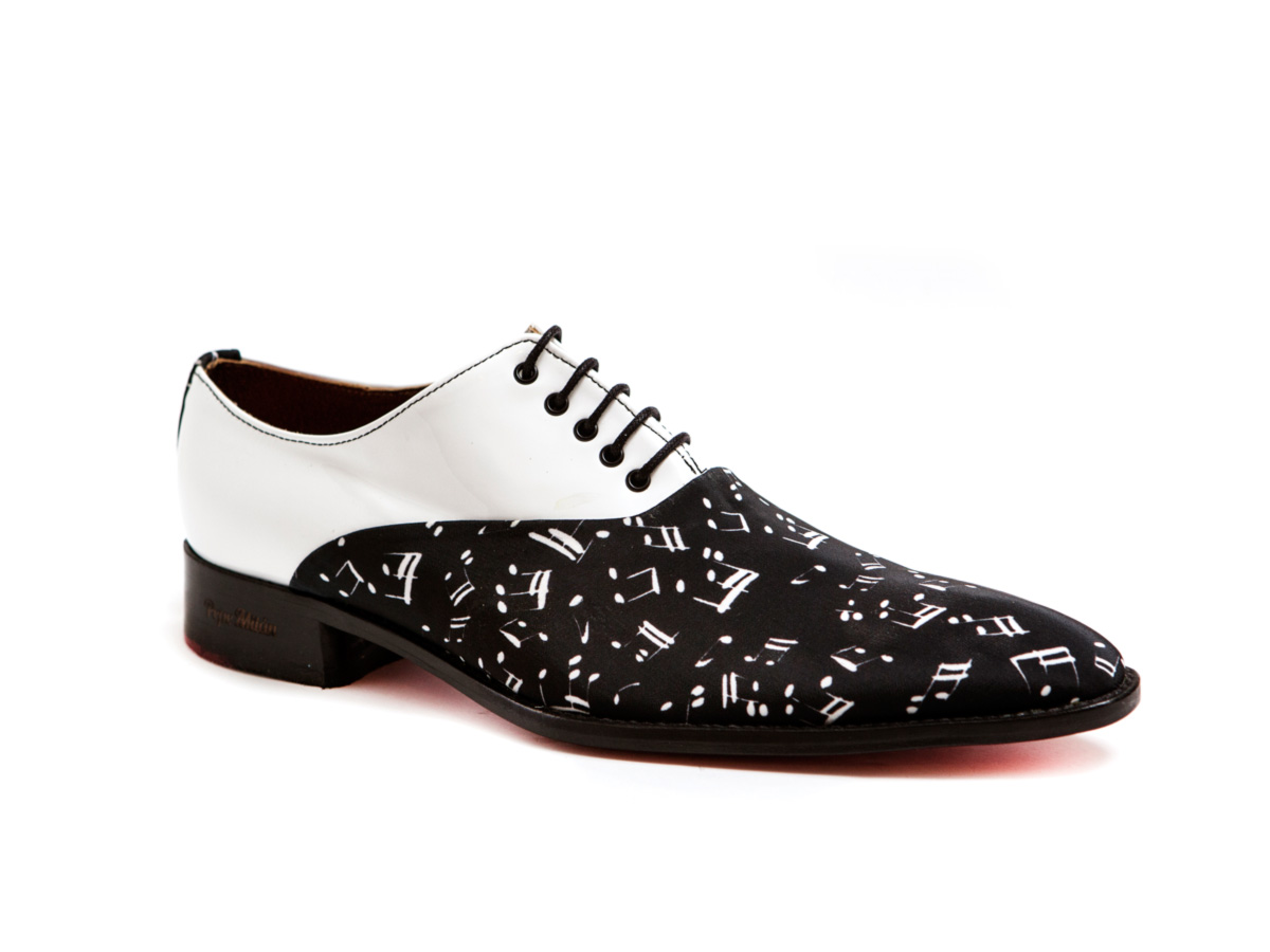 Fabriqué en musique fantastique et en cuir verni blanc. Vieux réservoir, semelle en cuir antidérapante cousue et semelle intérieure confort intégrée. Un design original, pour des gens heureux qui s'emballent au rythme de la musique et de l'art de vivre.