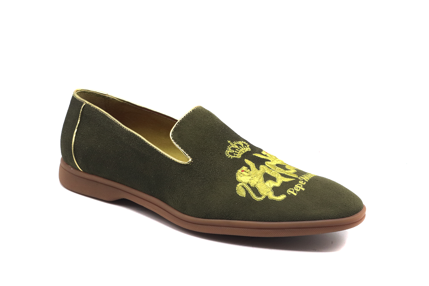 Chaussure modèle Balkan, conçue en Velours Vert Brodé Pepe Milan Gold Lions, semelle en cuir rouge avec une zone centrale antidérapante et avec des matériaux de haute qualité pour le confort maximum de tous nos clients.