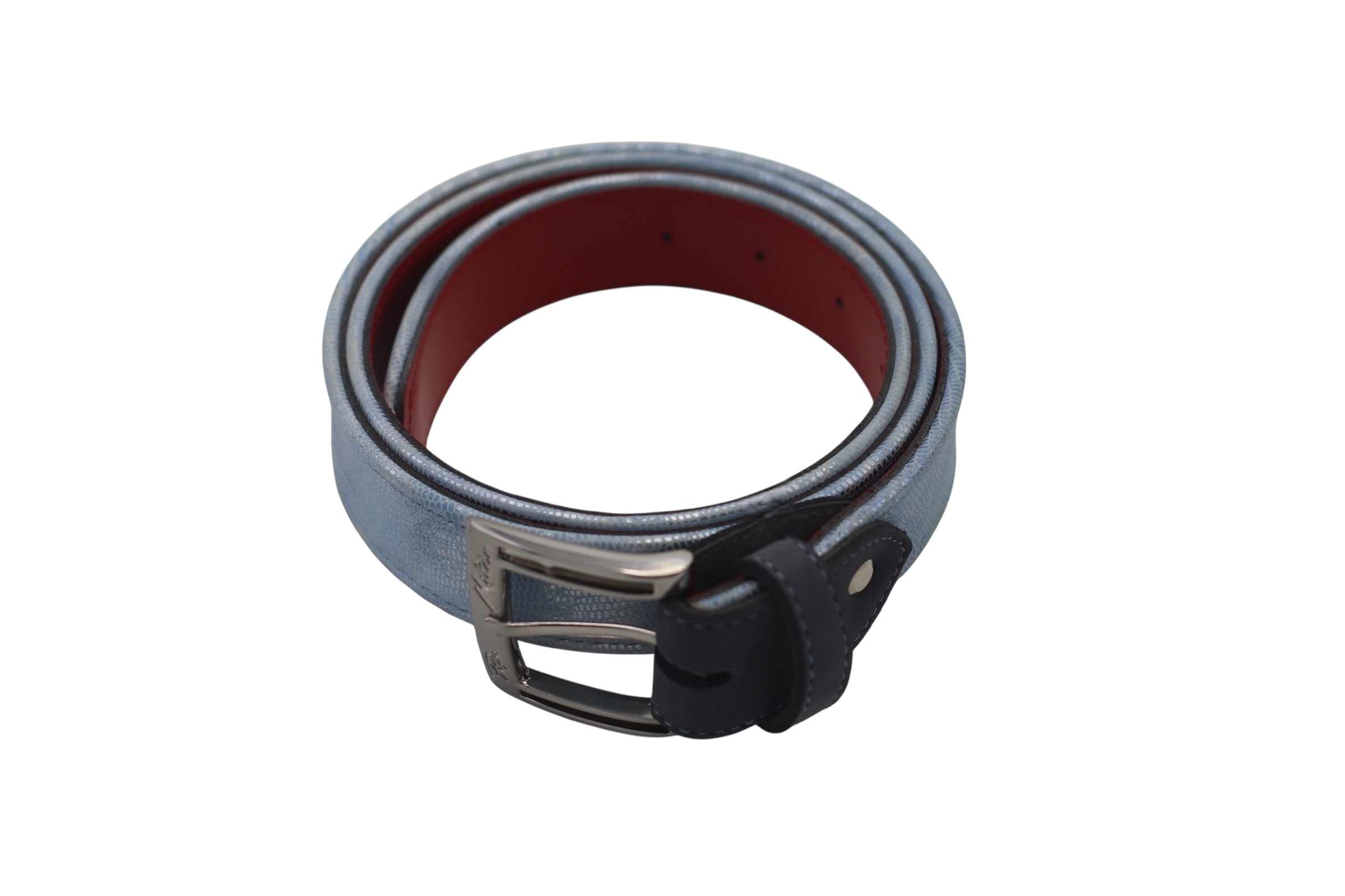 Ceinture en cuir, conçue en daim bleu marine et cuir nappa bleu ciel, avec des matériaux de haute qualité pour un confort optimal.