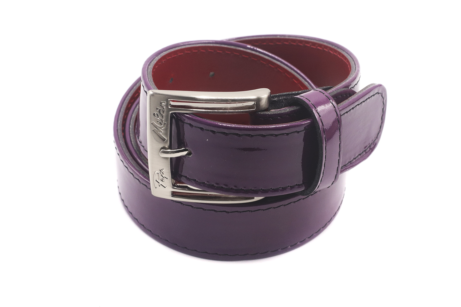 Ceinture modèle Azores En cuir verni lilas bamby, fabriquée à la main avec des matériaux de haute qualité.