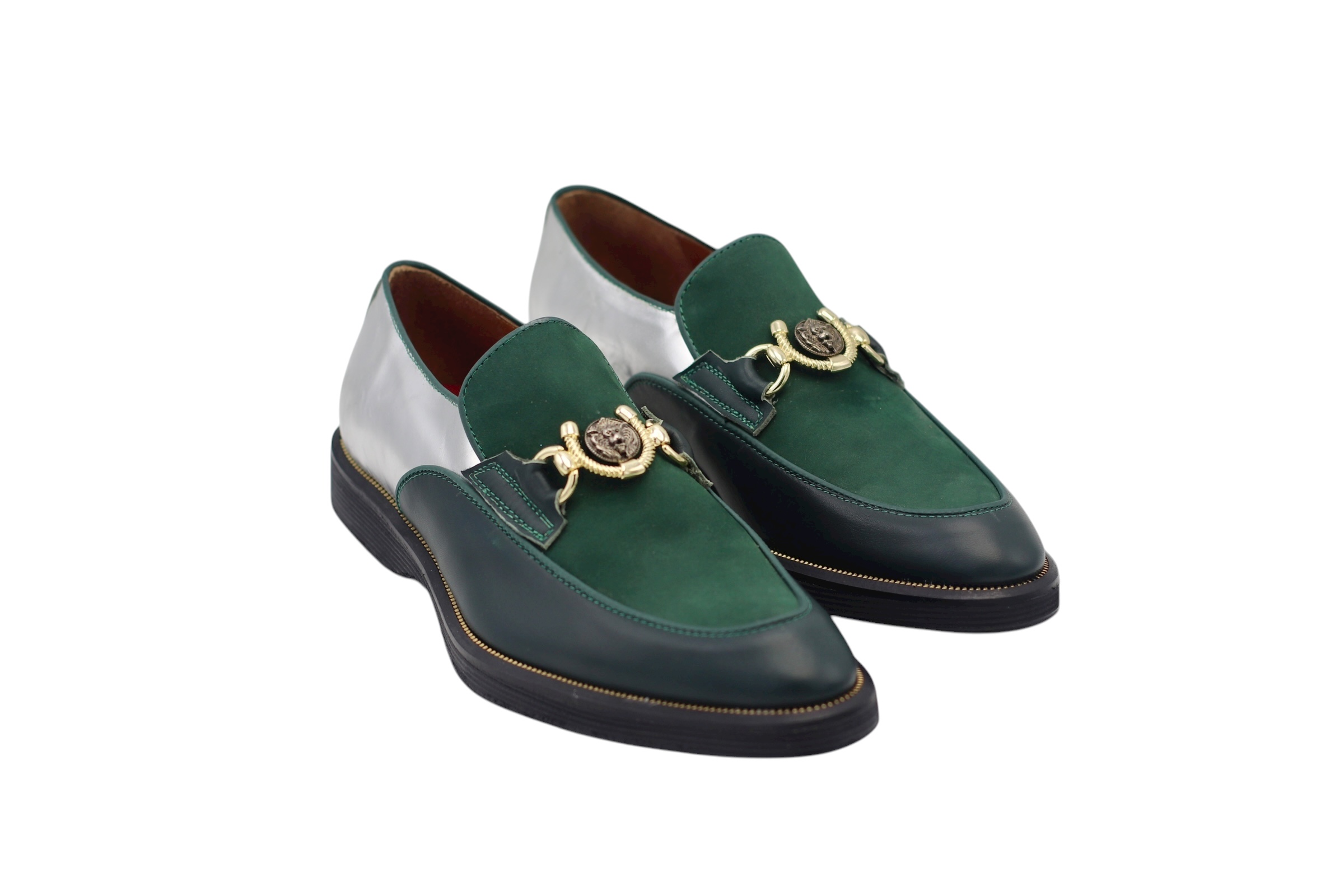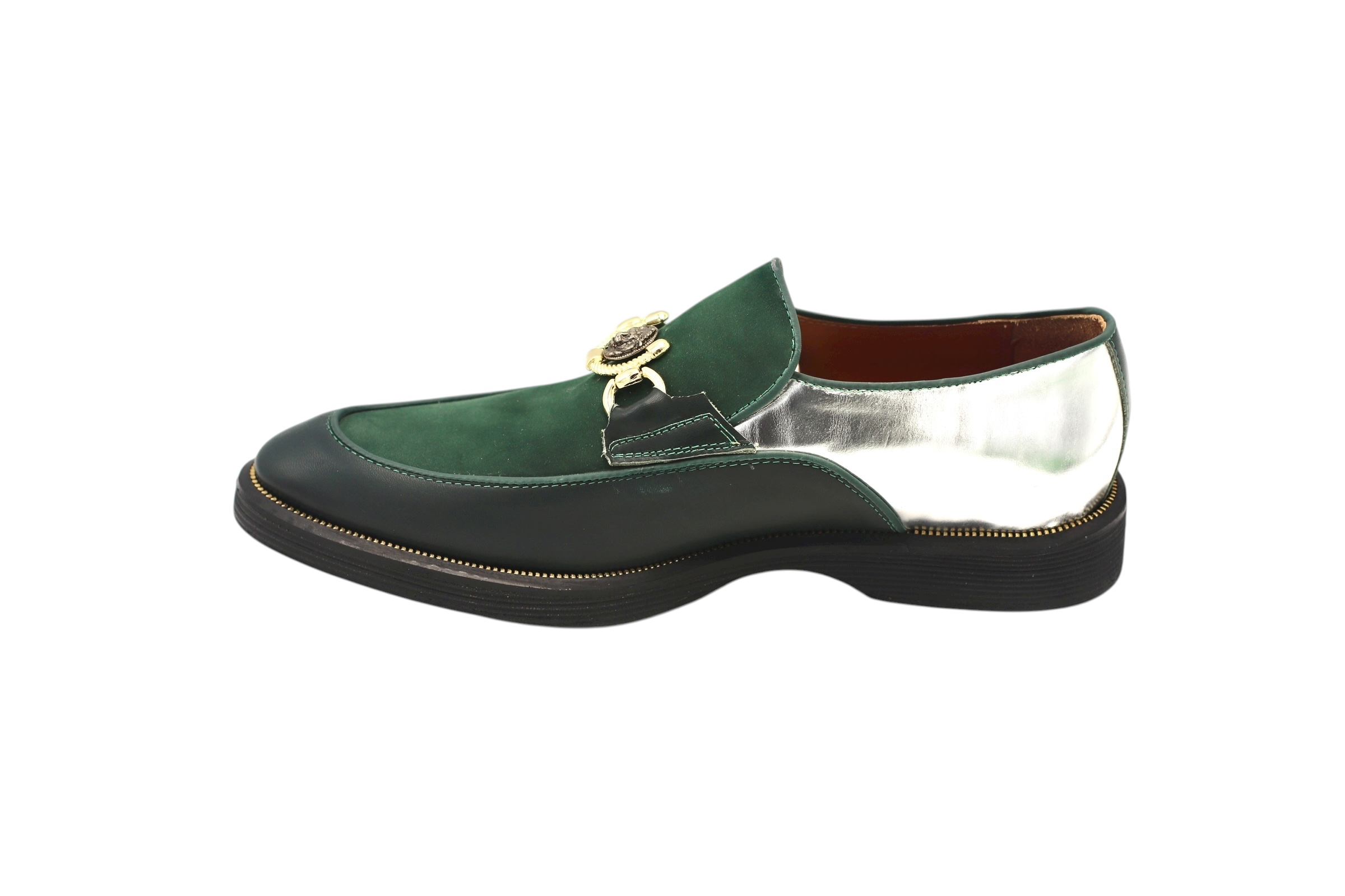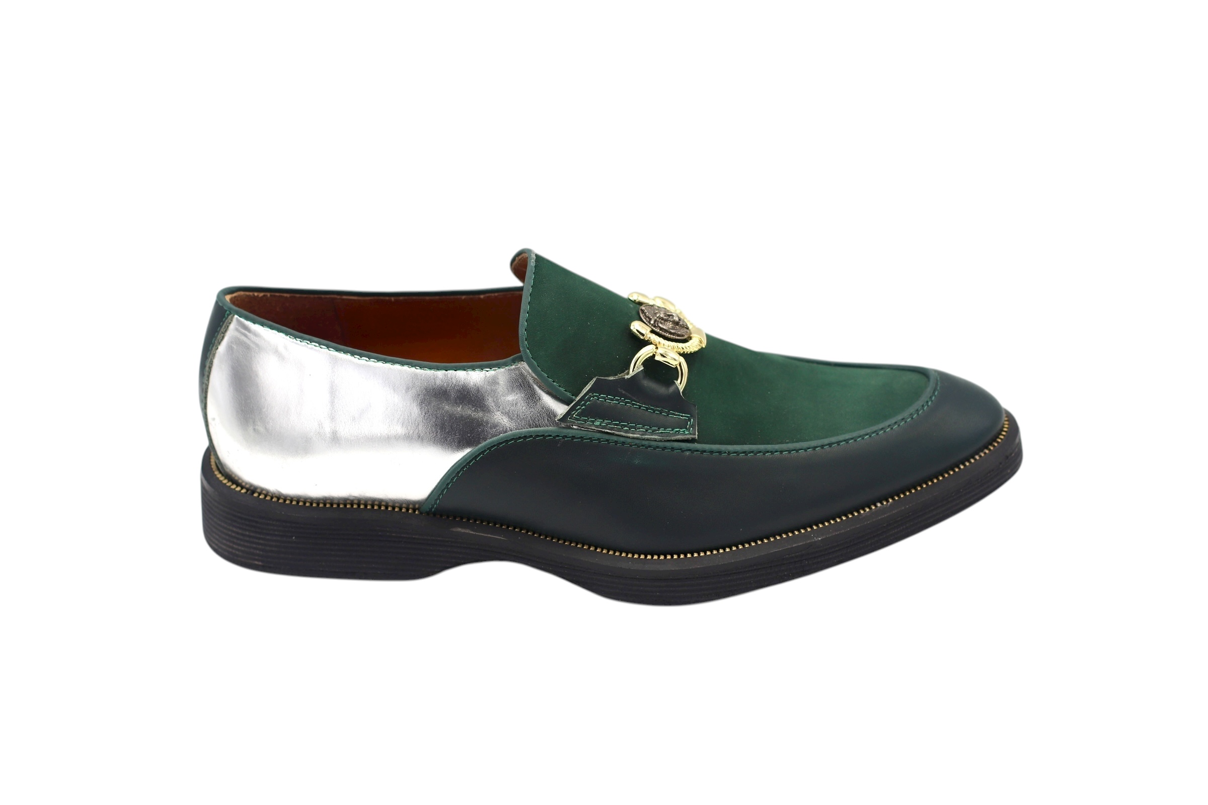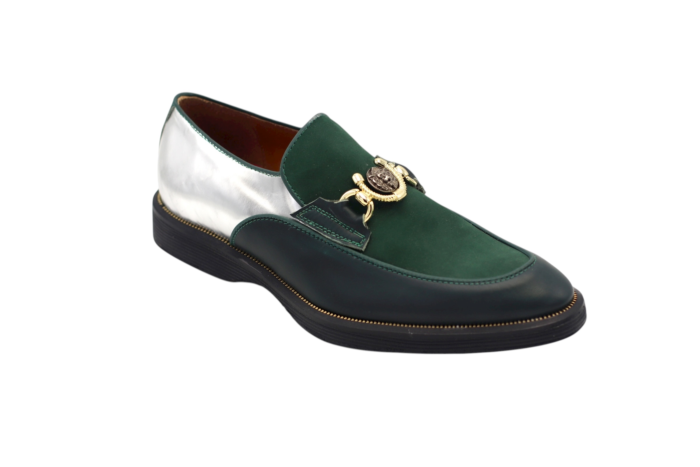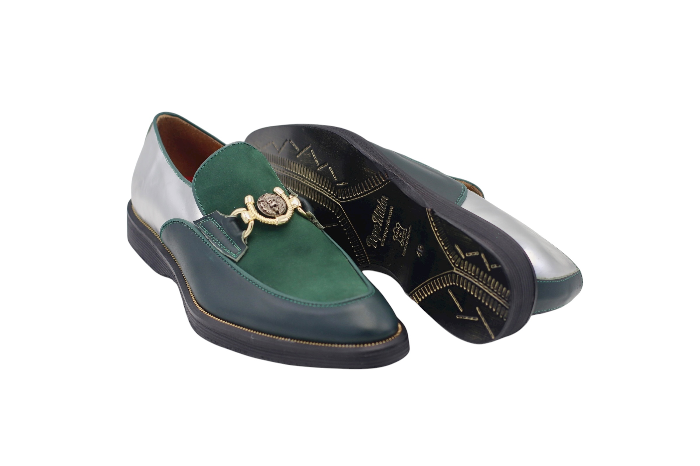 Chaussure en cuir nappa, déclinée en nappa argenté, nappa vert et nubuck vert, avec une semelle en cuir noir et des matériaux haut de gamme pour un confort optimal.