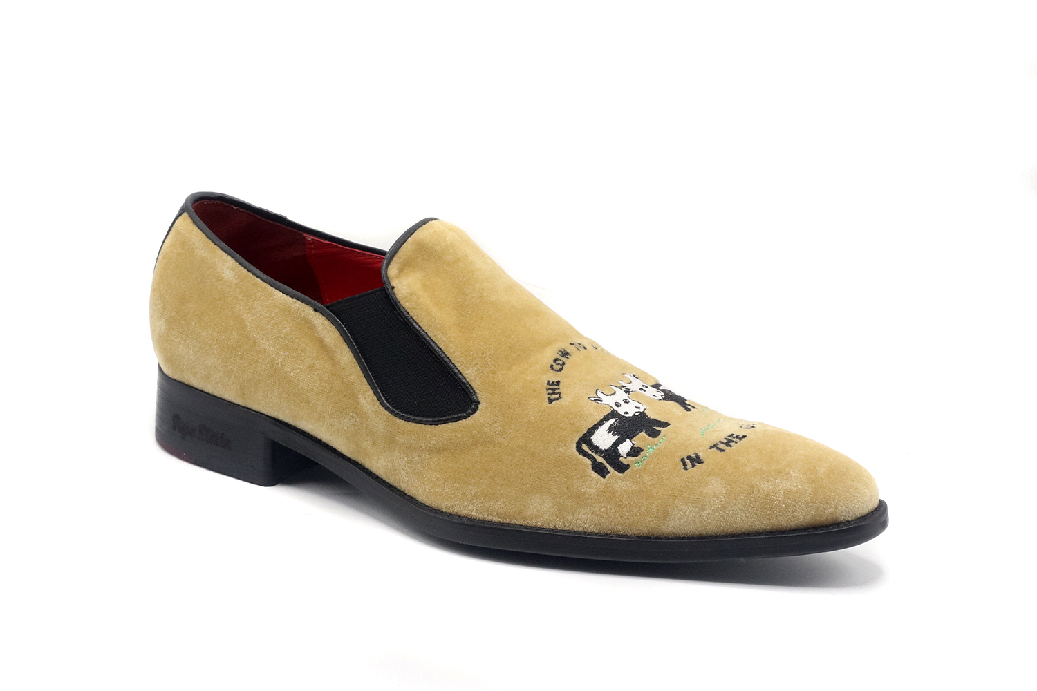Chaussure modèle Grass, conçue en VACHES BRODÉES EN VELOURS BEIGE, semelle en cuir rouge avec une zone centrale antidérapante et avec des matériaux de haute qualité pour le confort maximum de tous nos clients.