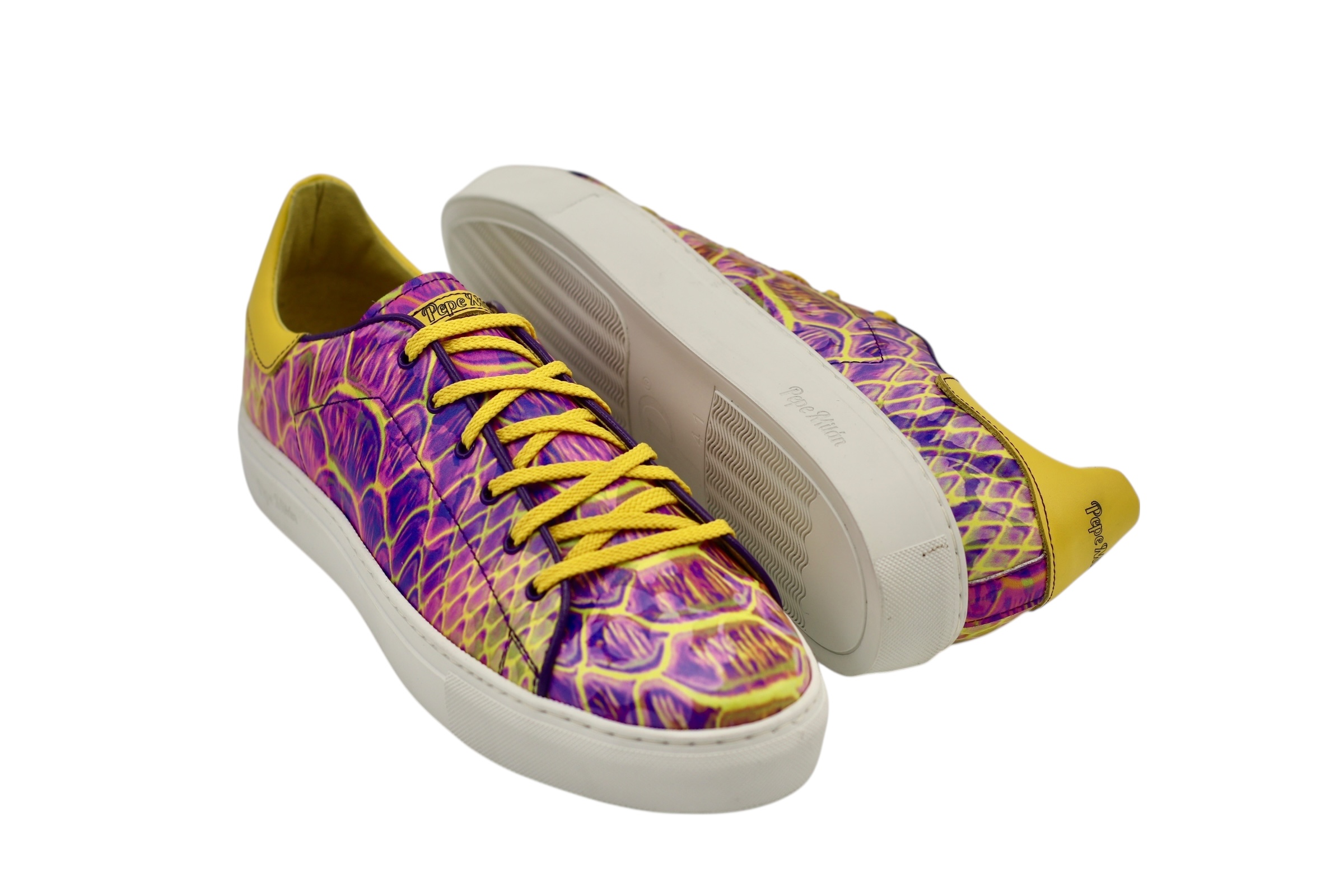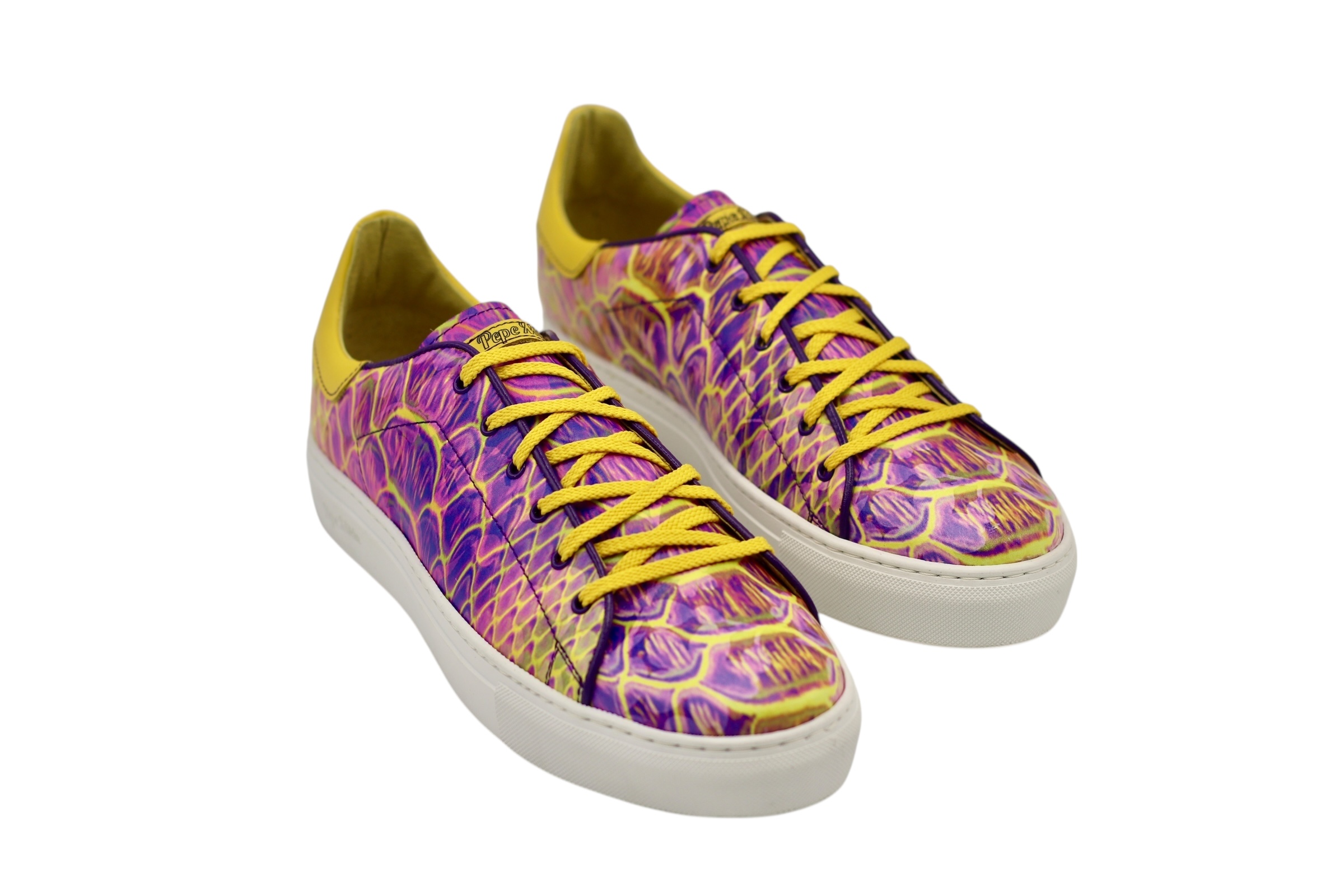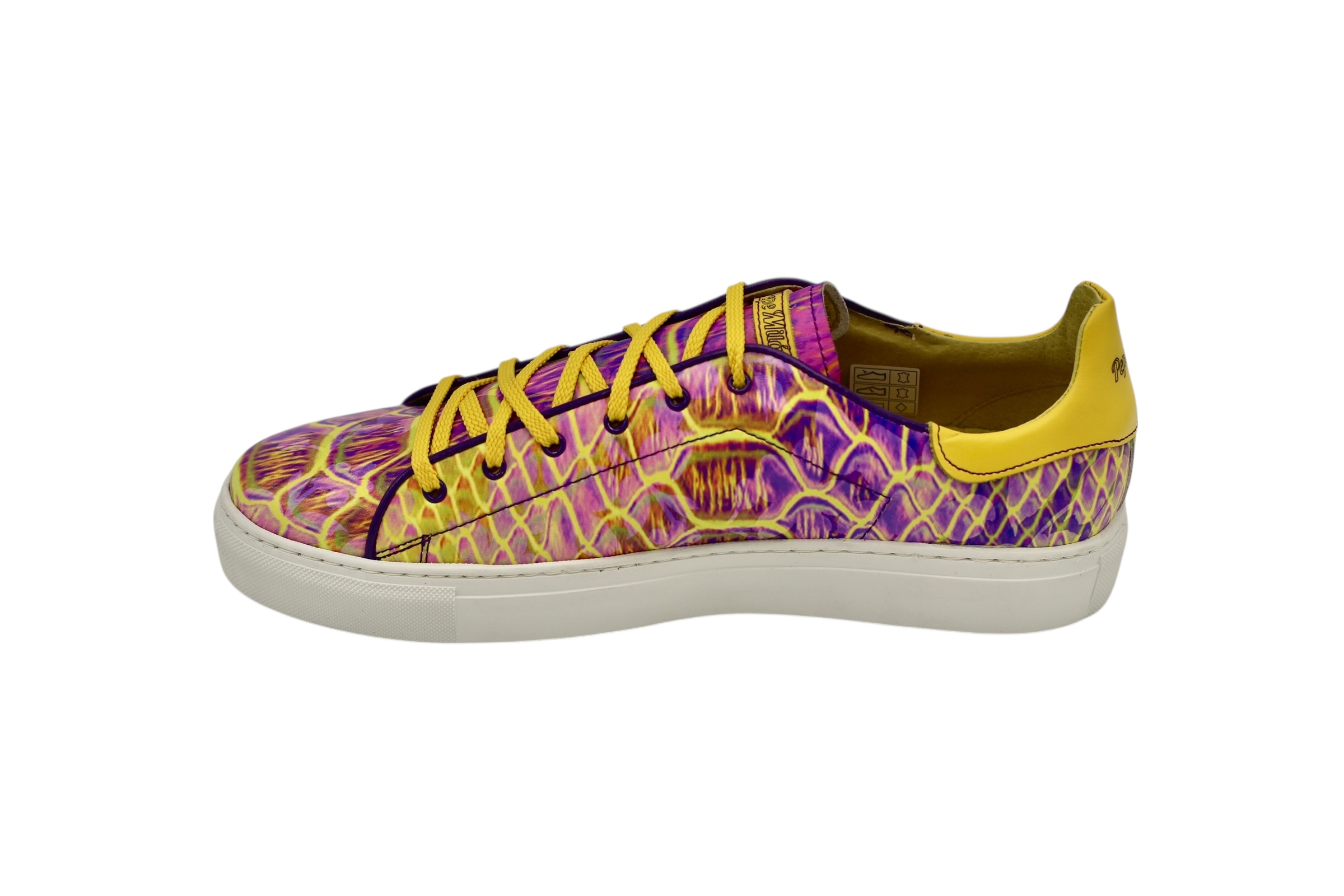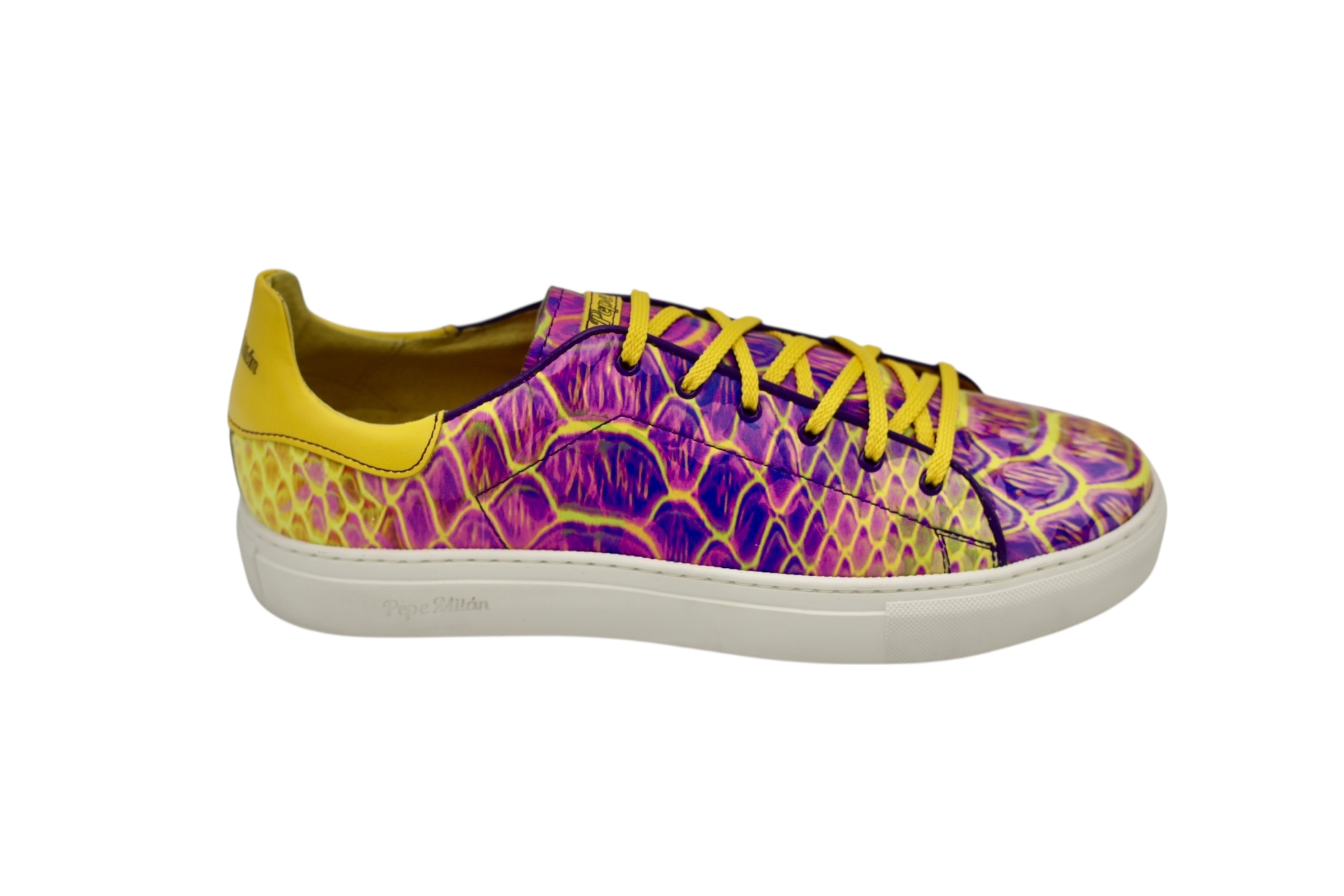 Baskets Iris, semelle en caoutchouc blanc Bombay, imprimés de couleurs vives sur cuir : confort et style à vos pieds.