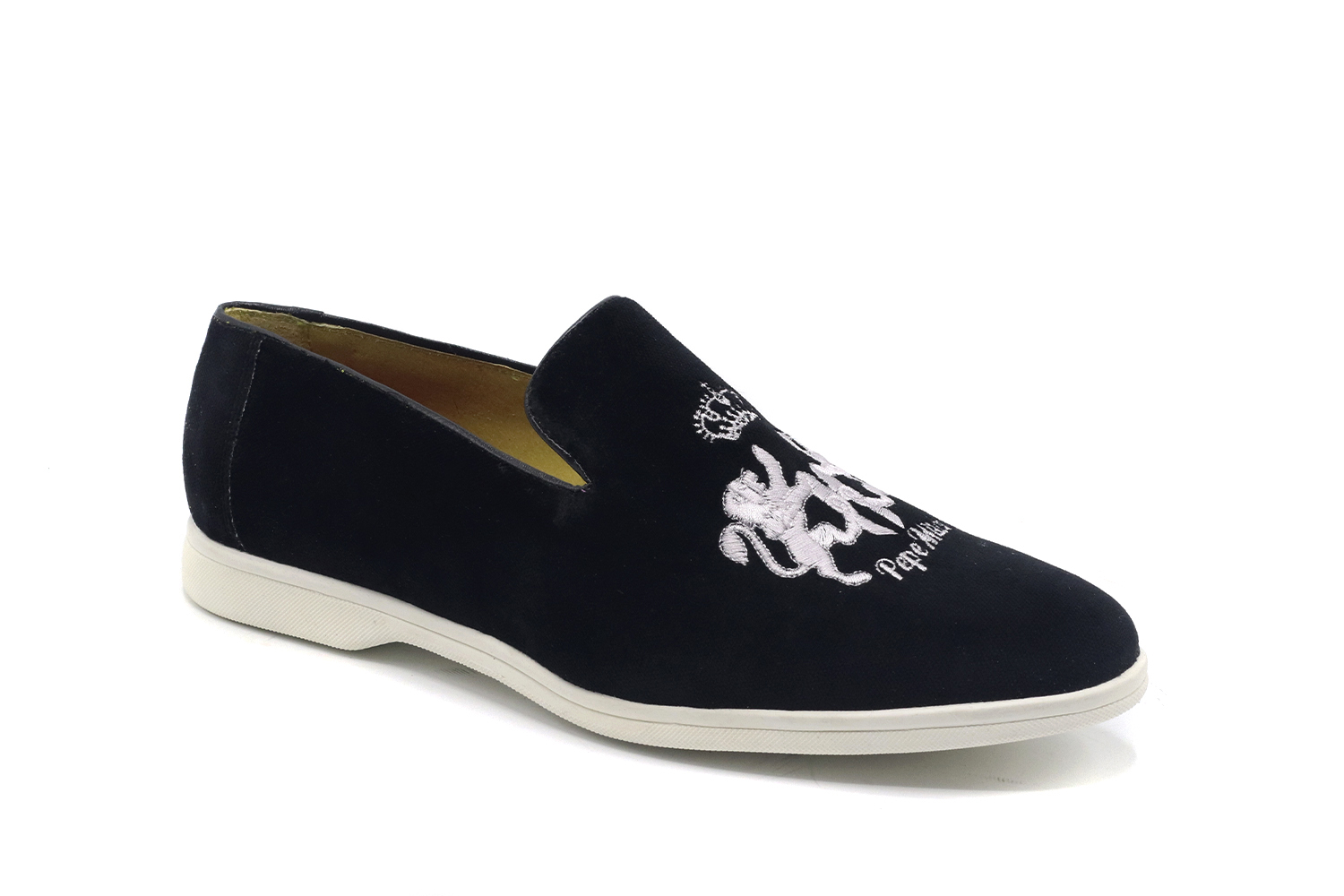 Chaussure modèle Leo, conçue en Velours Noir Brodé Pepe Milan Gold Lions, semelle en cuir rouge avec une zone centrale antidérapante et avec des matériaux de haute qualité pour le confort maximum de tous nos clients.