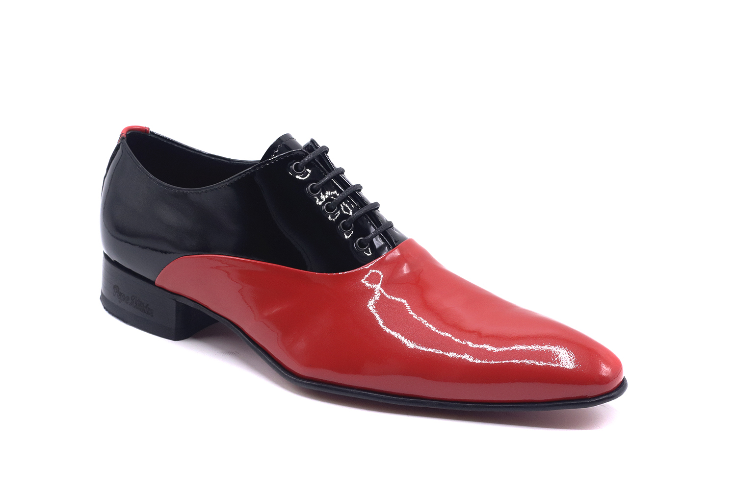 Modèle en cuir verni qui éblouit à courte distance grâce à sa couleur vibrante et à l'association toujours réussie du rouge et du noir.