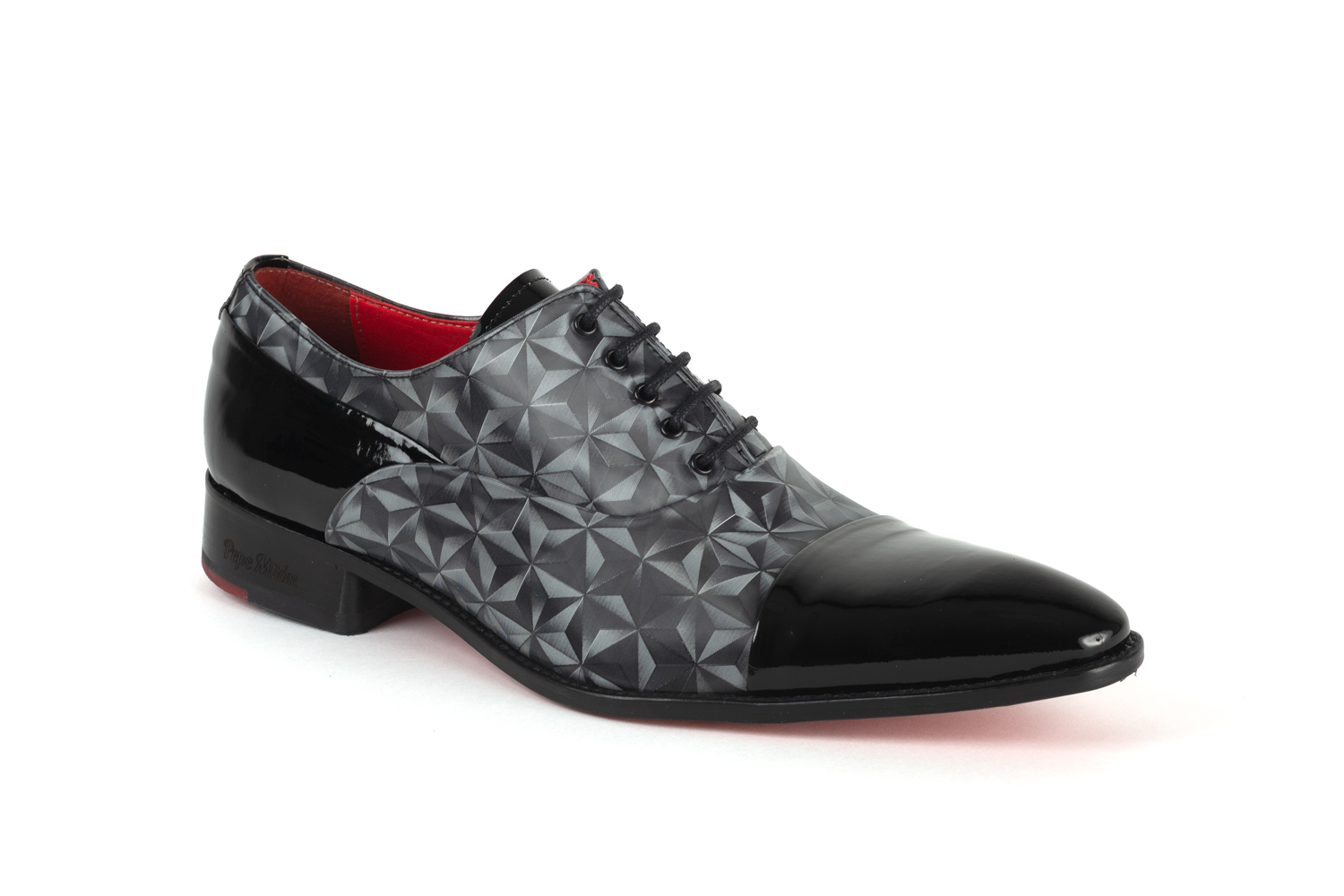 Chaussure en cuir verni, conçue en cuir verni Réglisse, semelle en cuir rouge avec une zone centrale antidérapante et avec des matériaux de haute qualité pour le confort maximum de tous nos clients.