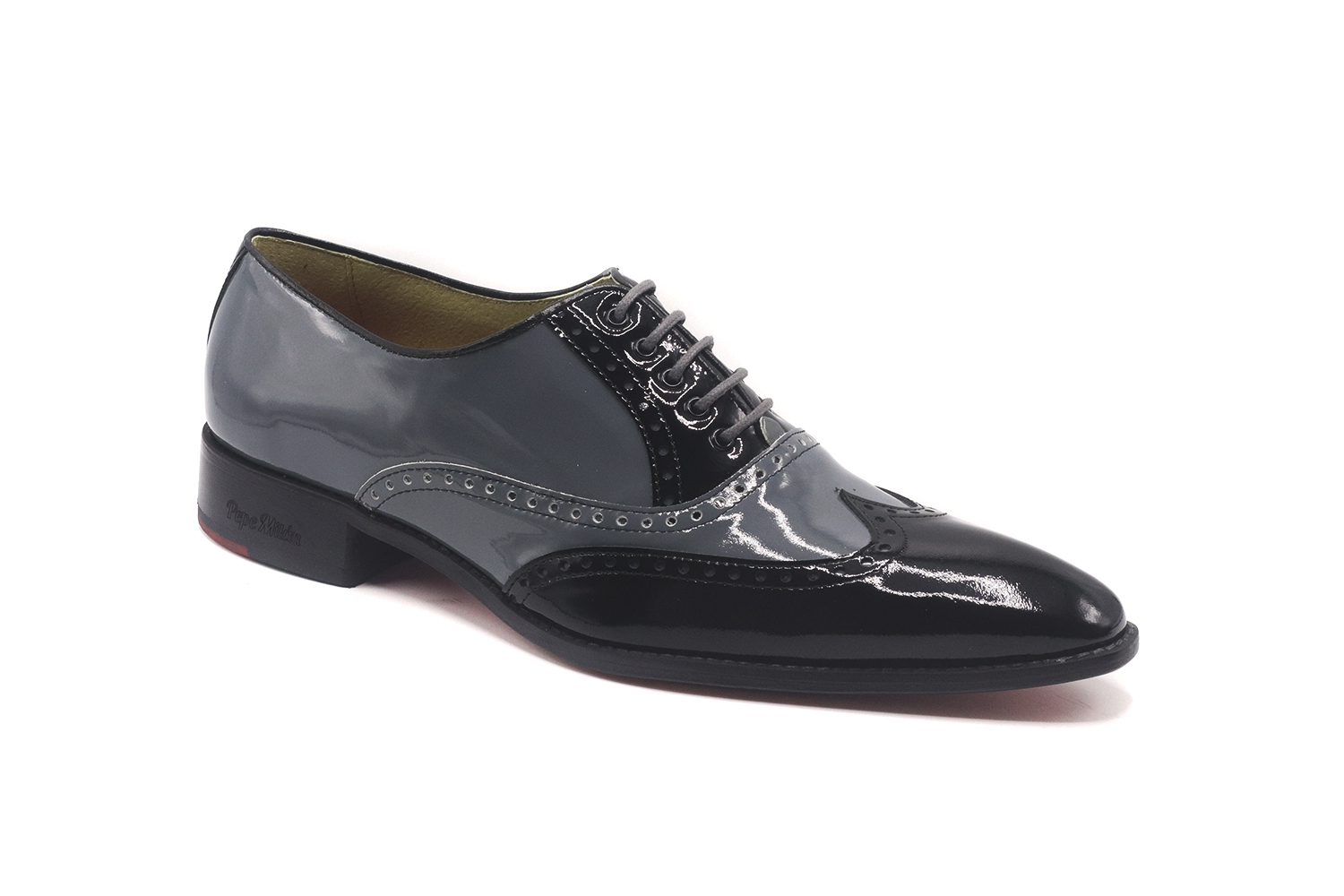 Chaussure en cuir verni, conçue en cuir verni Lord Grey et Noir, semelle en cuir rouge avec une zone centrale antidérapante et avec des matériaux de haute qualité pour le confort maximum de tous nos clients.