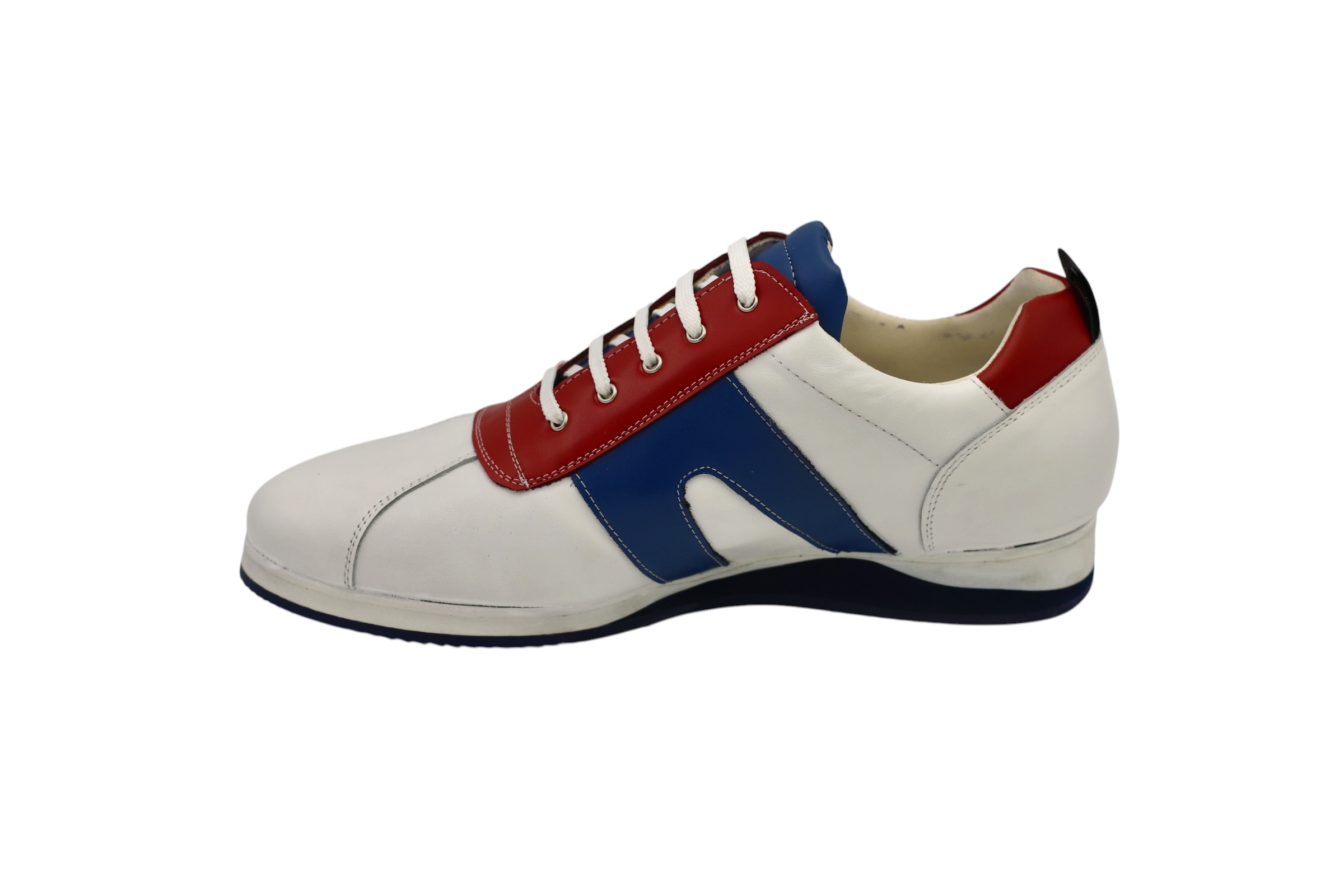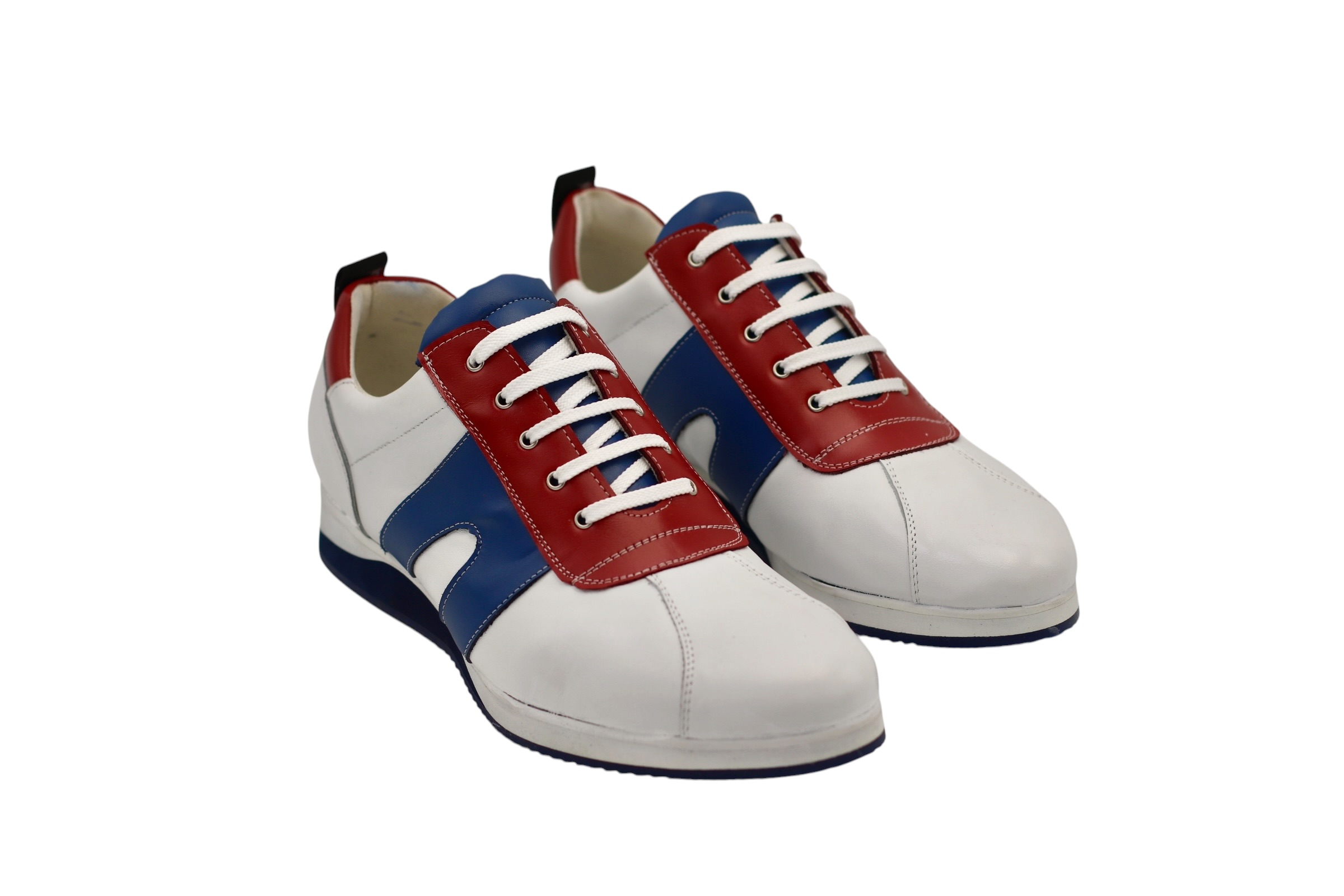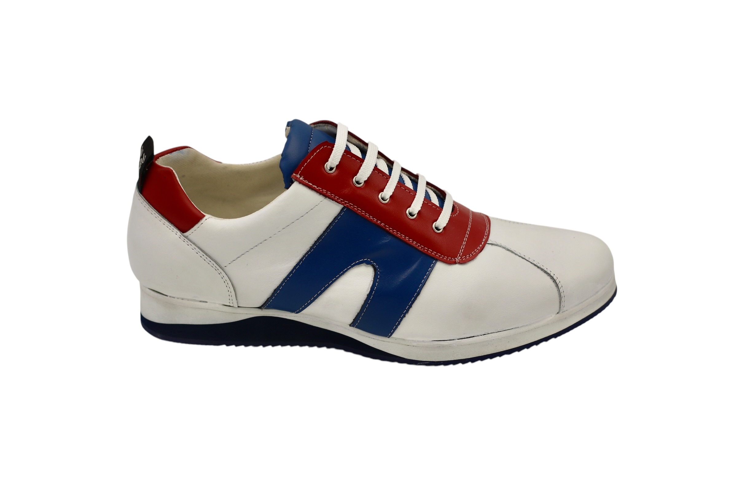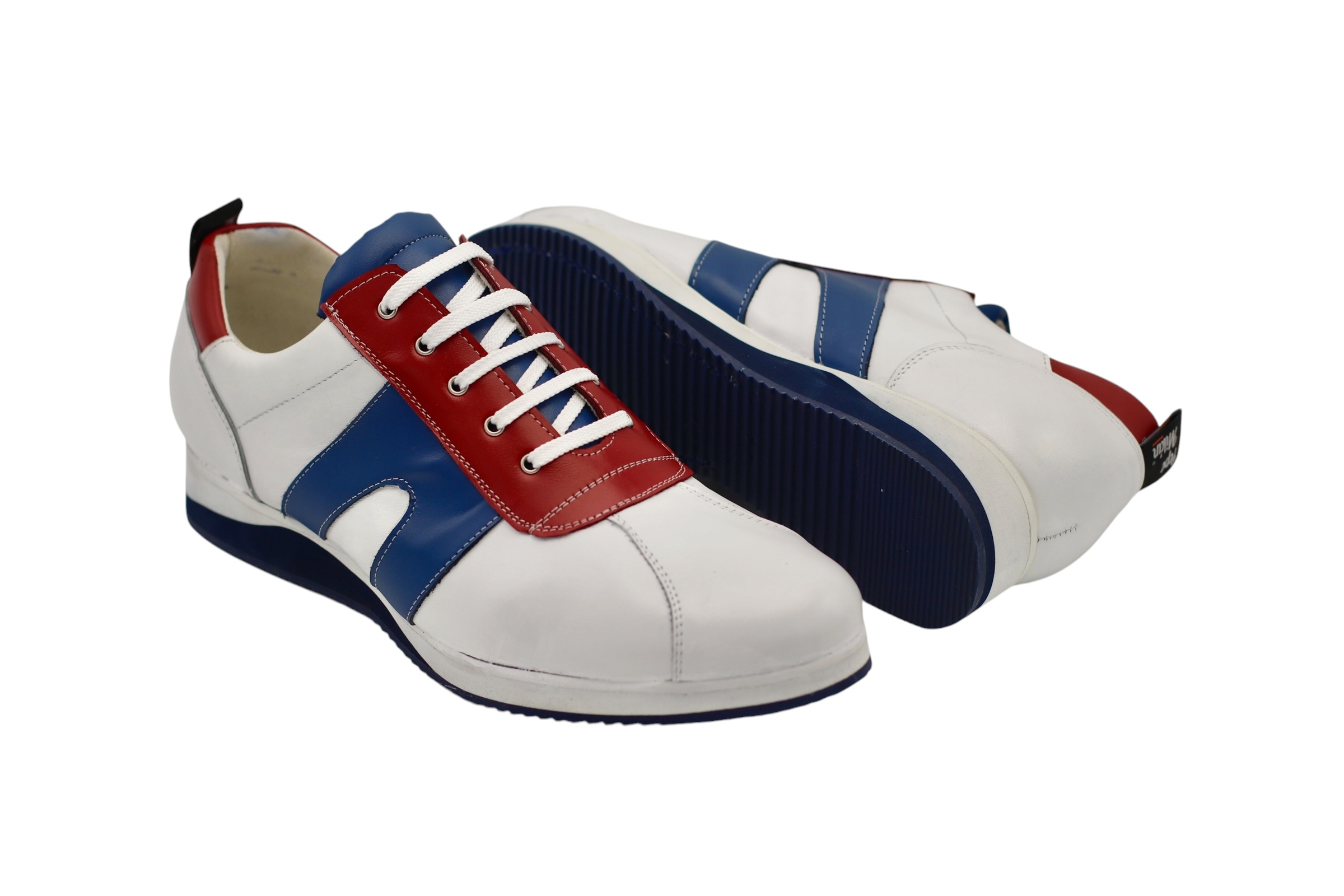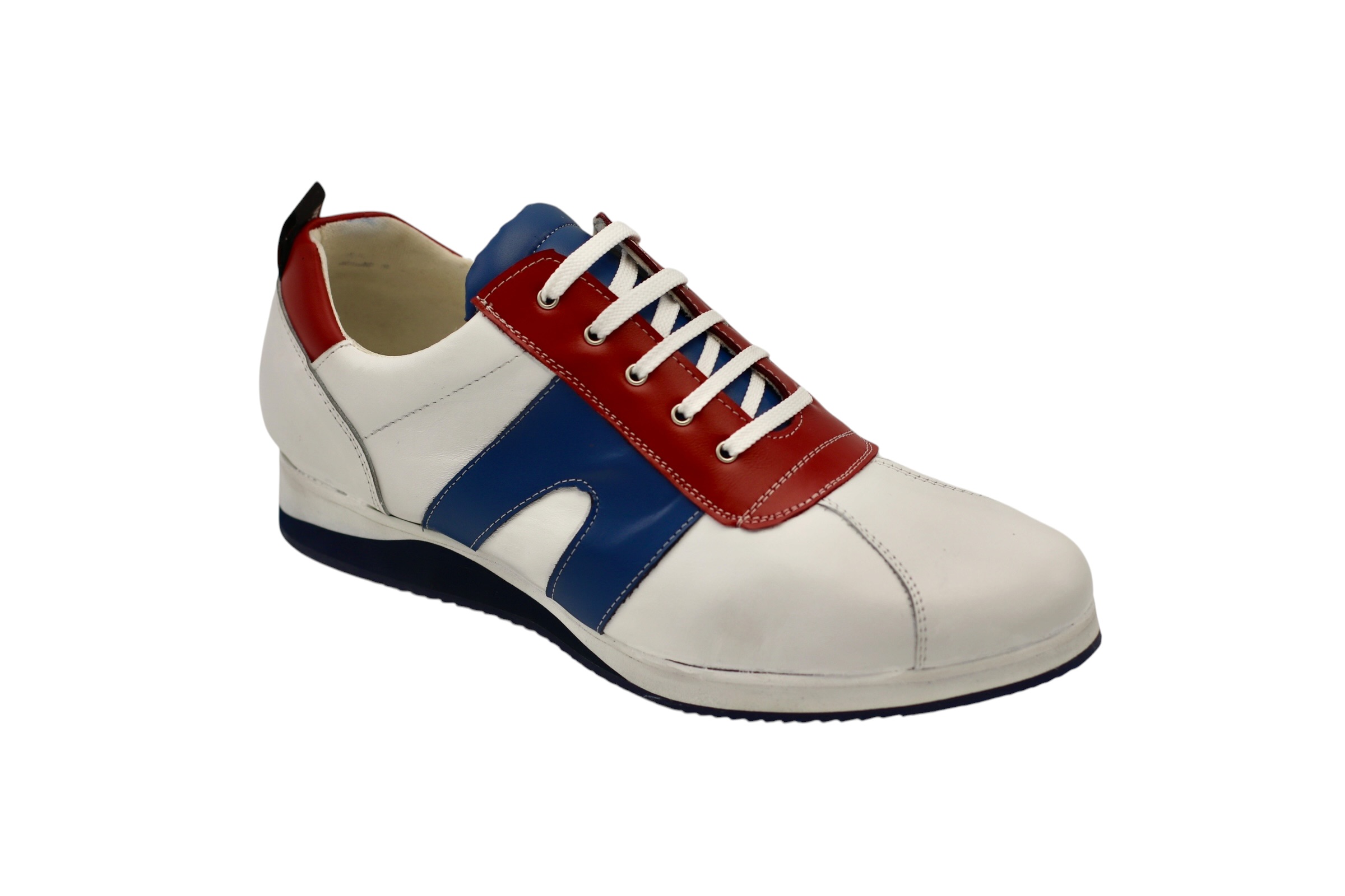 Baskets modèle Eisley, conçues en blanc rouge Napa et bleu Milan Bison Flat Runner.