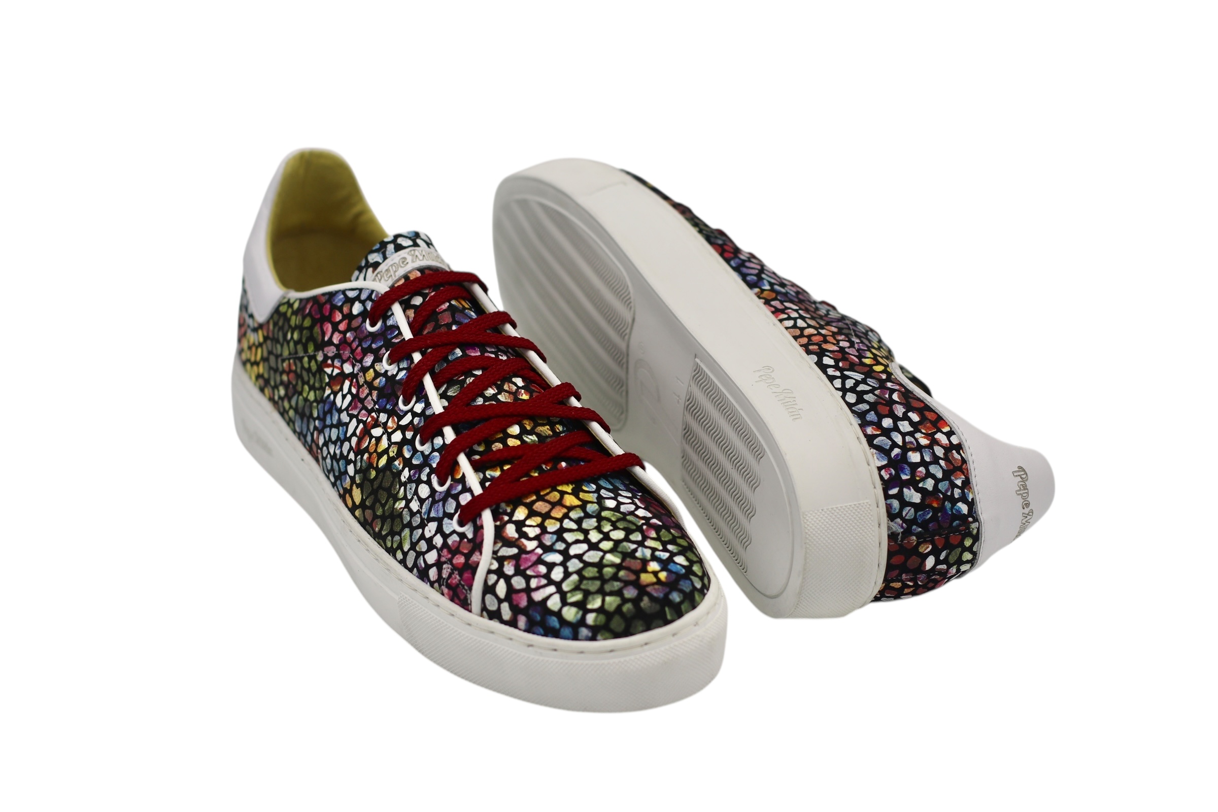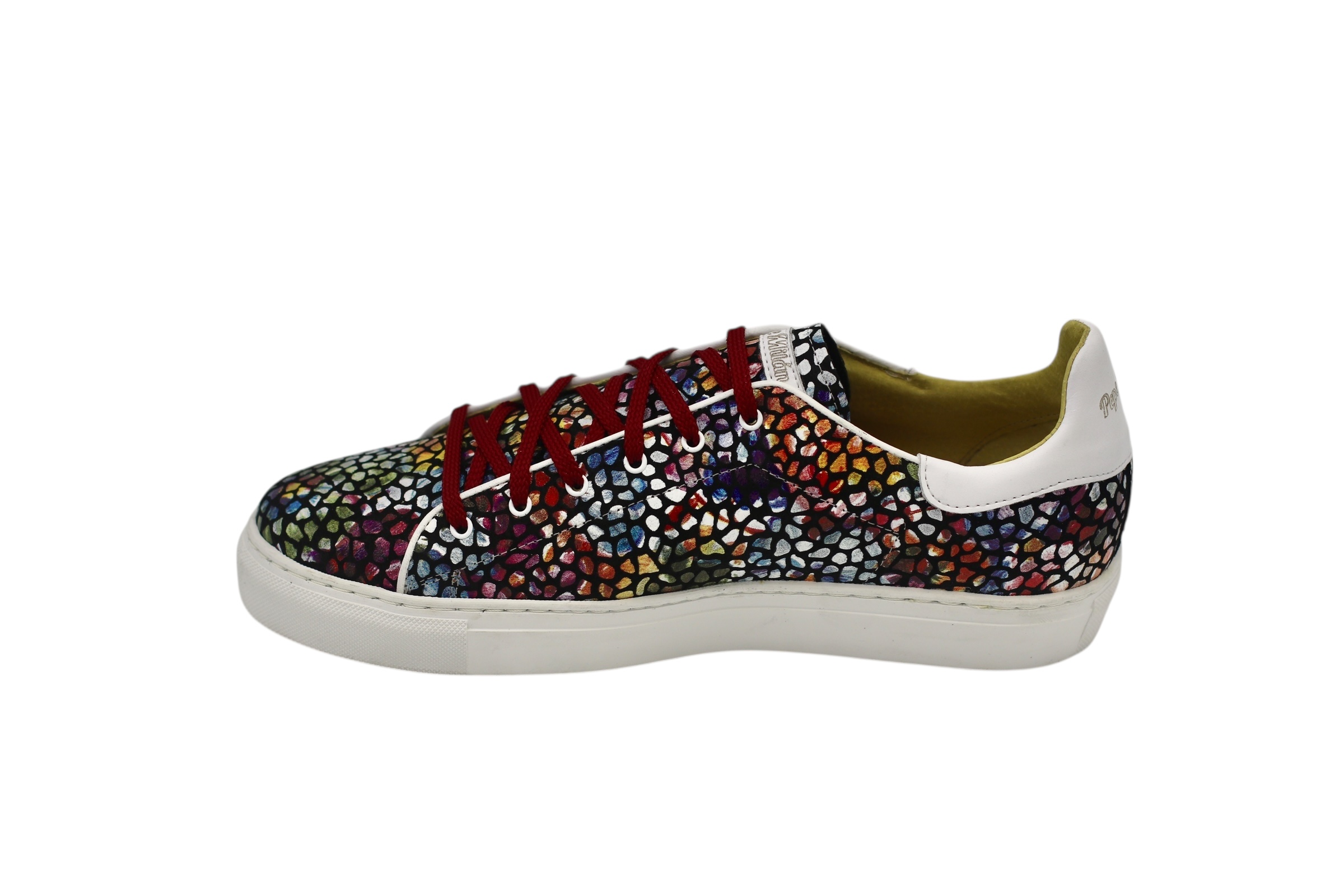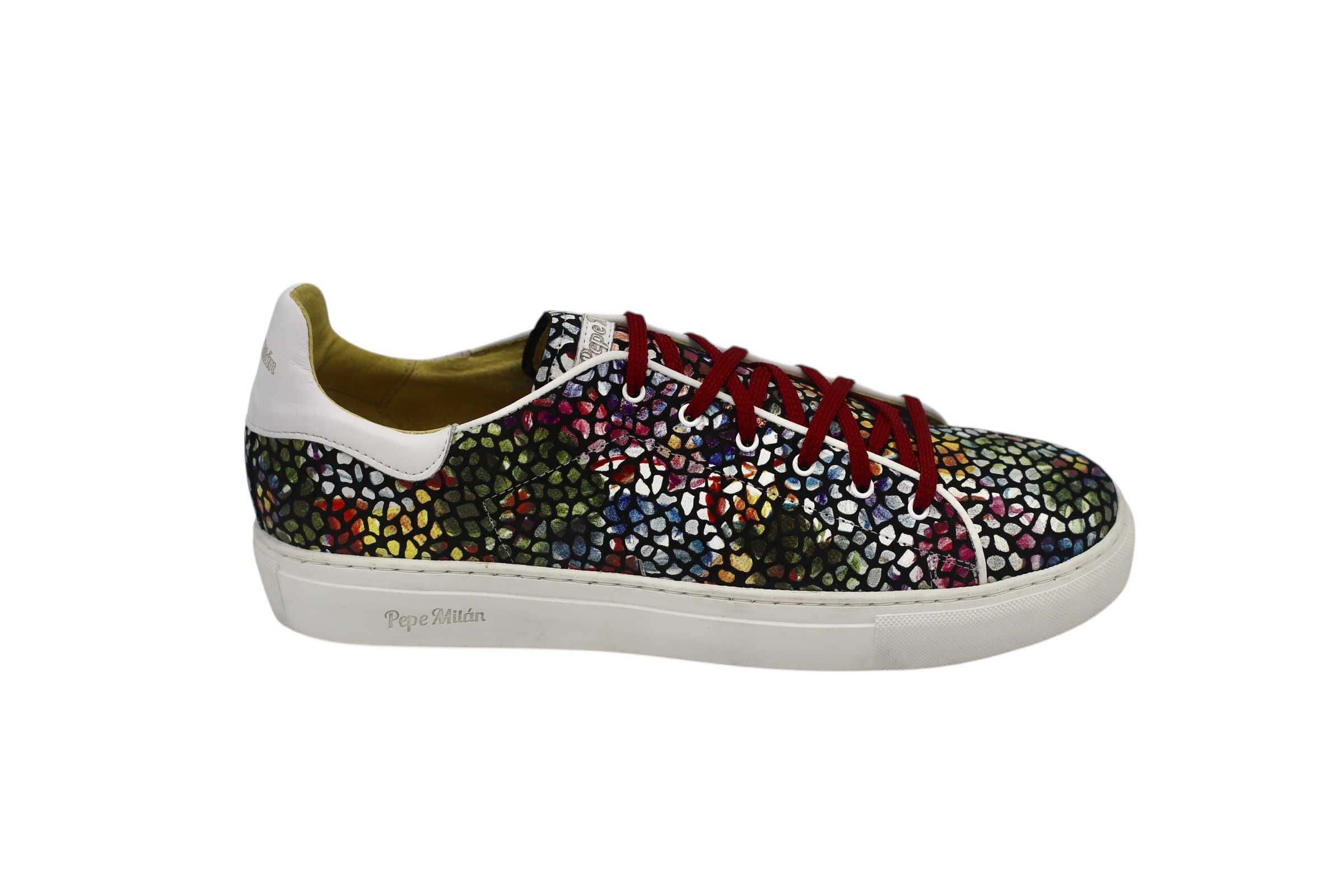 Baskets Piedras Multi, semelle en caoutchouc blanc Bombay, imprimés cuir éclatants, confort et style pour vos pieds.