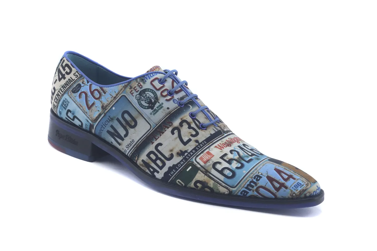 Chaussure plate, motif plaques d'immatriculation, passepoil bleu Milan, semelle de skate bleu Milan, forme Cuba.