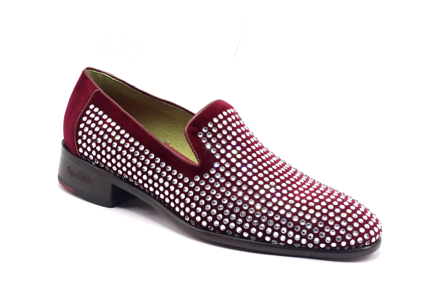 Chaussure modèle Rubí, conçue en velours bordeaux avec des pierres brillantes incrustées, semelle en cuir rouge avec une zone centrale antidérapante et avec des matériaux de haute qualité pour le confort maximum de tous nos clients.