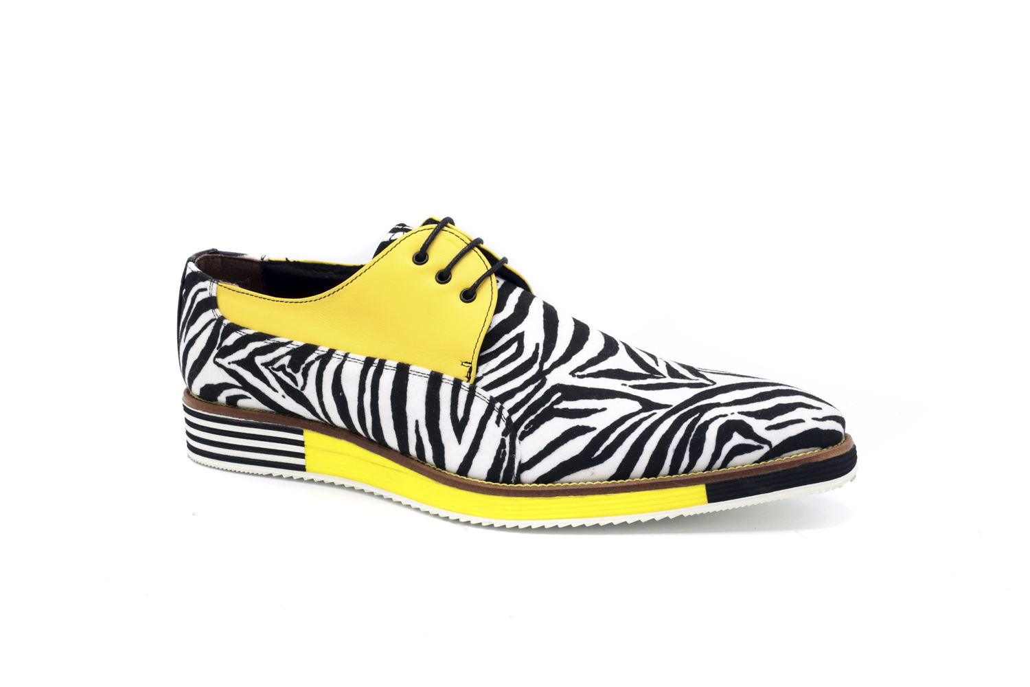 Modèle de sneaker pour femme Sabana, conçu en cuir nappa jaune et cuir nappa zèbre. Avec une semelle en caoutchouc blanche avec une semelle intermédiaire zébrée, bleue et jaune. Avec une semelle intérieure confort intégrée. Design original, conçu avec des matériaux de haute qualité, nous travaillons sur le design et l'originalité de nos chaussures. Nous vous apportons du confort