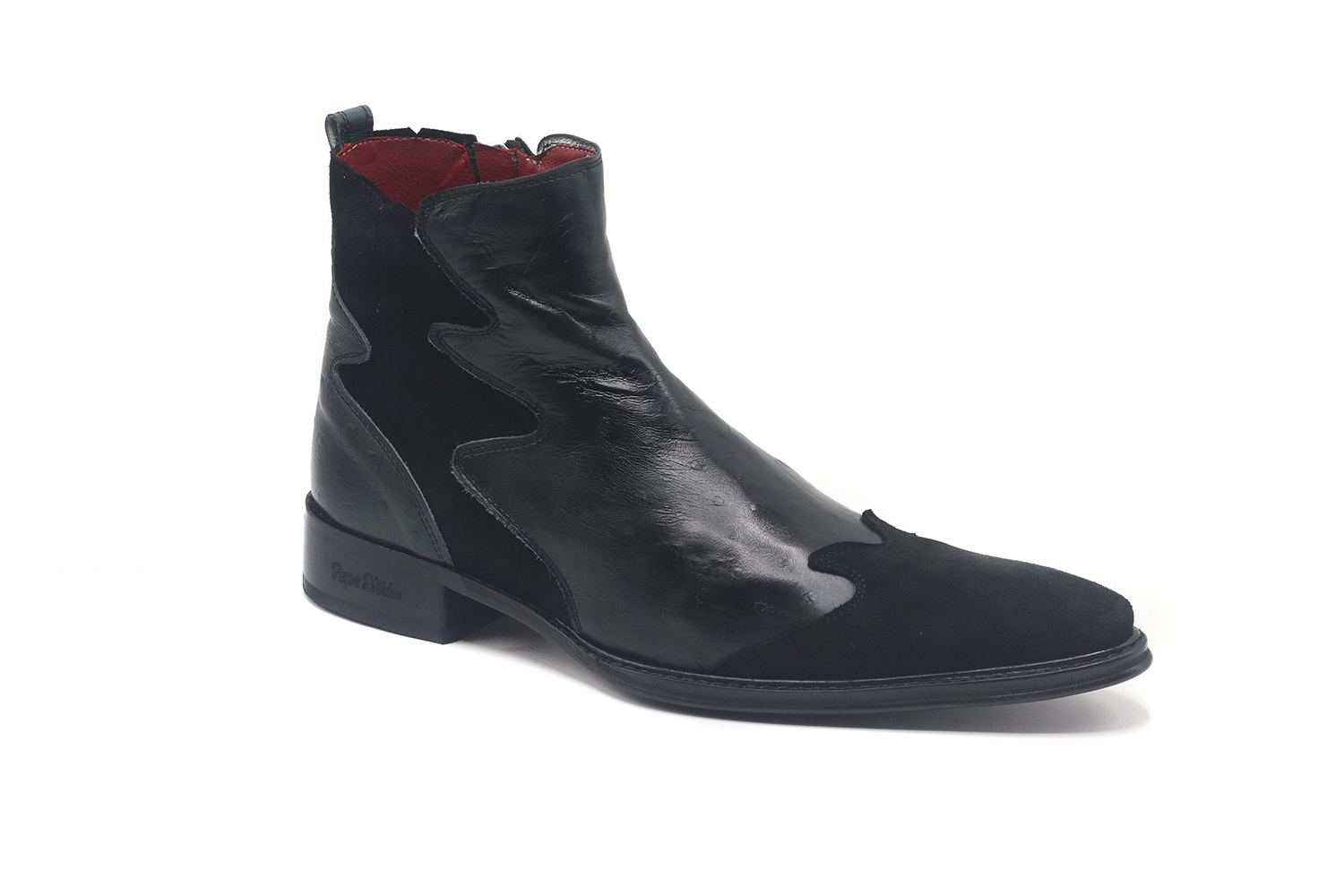 Bottine modèle Sierra, conçue en forme Black Ostrich Green Plush Avila et semelle combinée. Magnifique modèle qui se distingue par son originalité, caractéristique de la marque Pepe Milan.