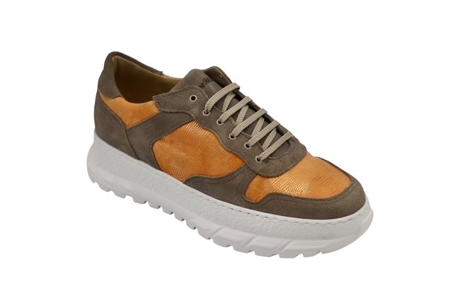 Baskets en cuir, confectionnées en daim gris et cuir nappa orange, avec une semelle en caoutchouc antidérapante et des matériaux de haute qualité pour un confort optimal.